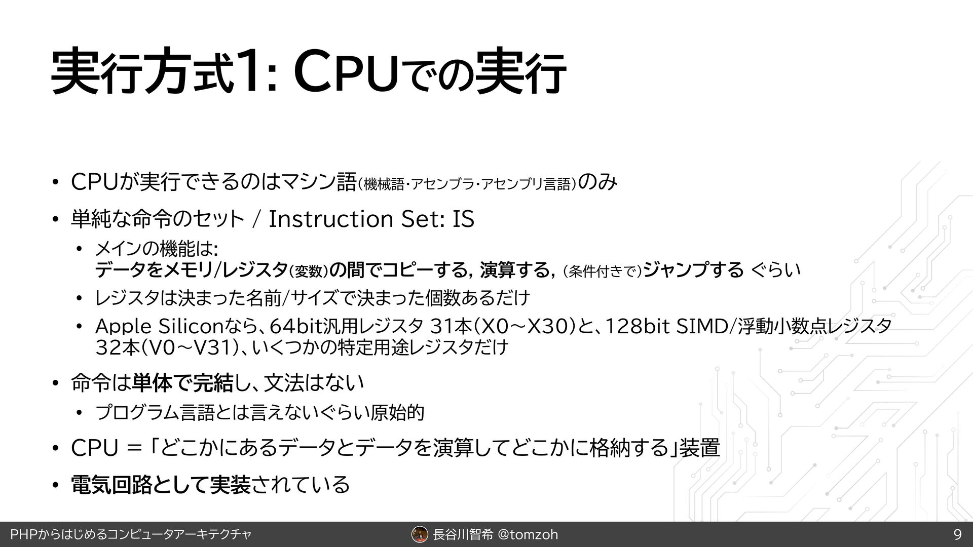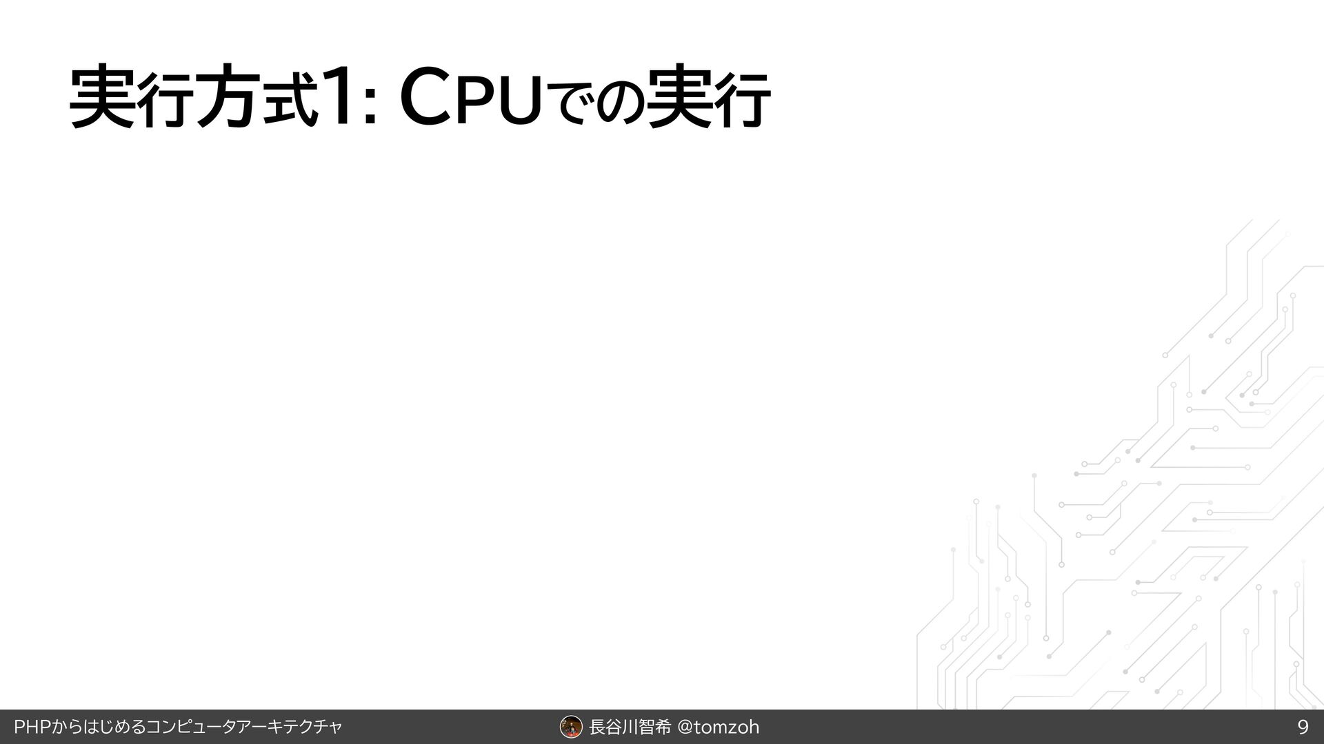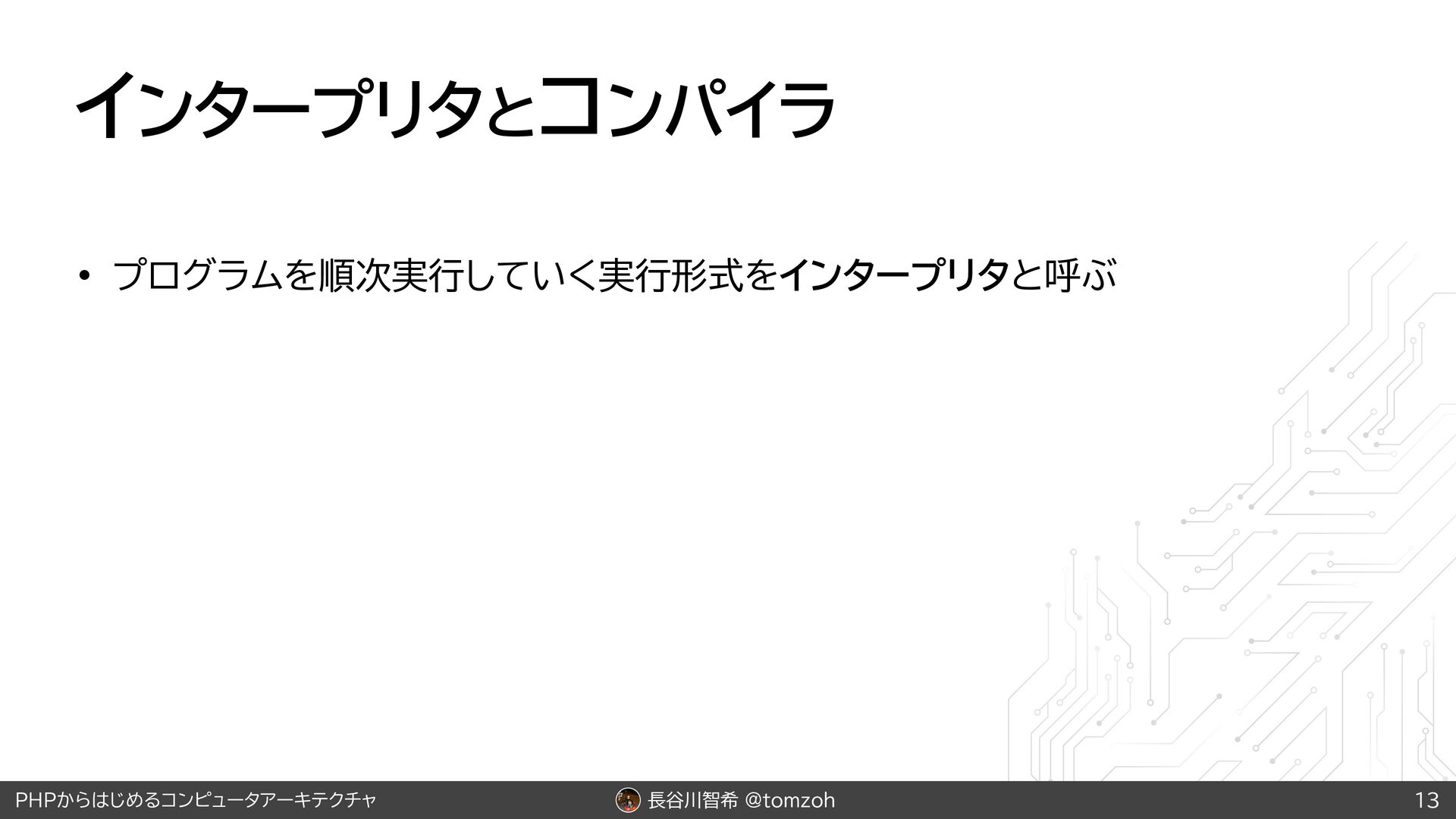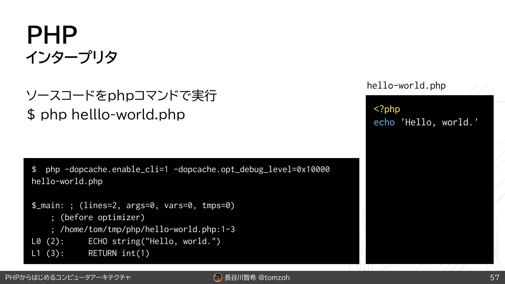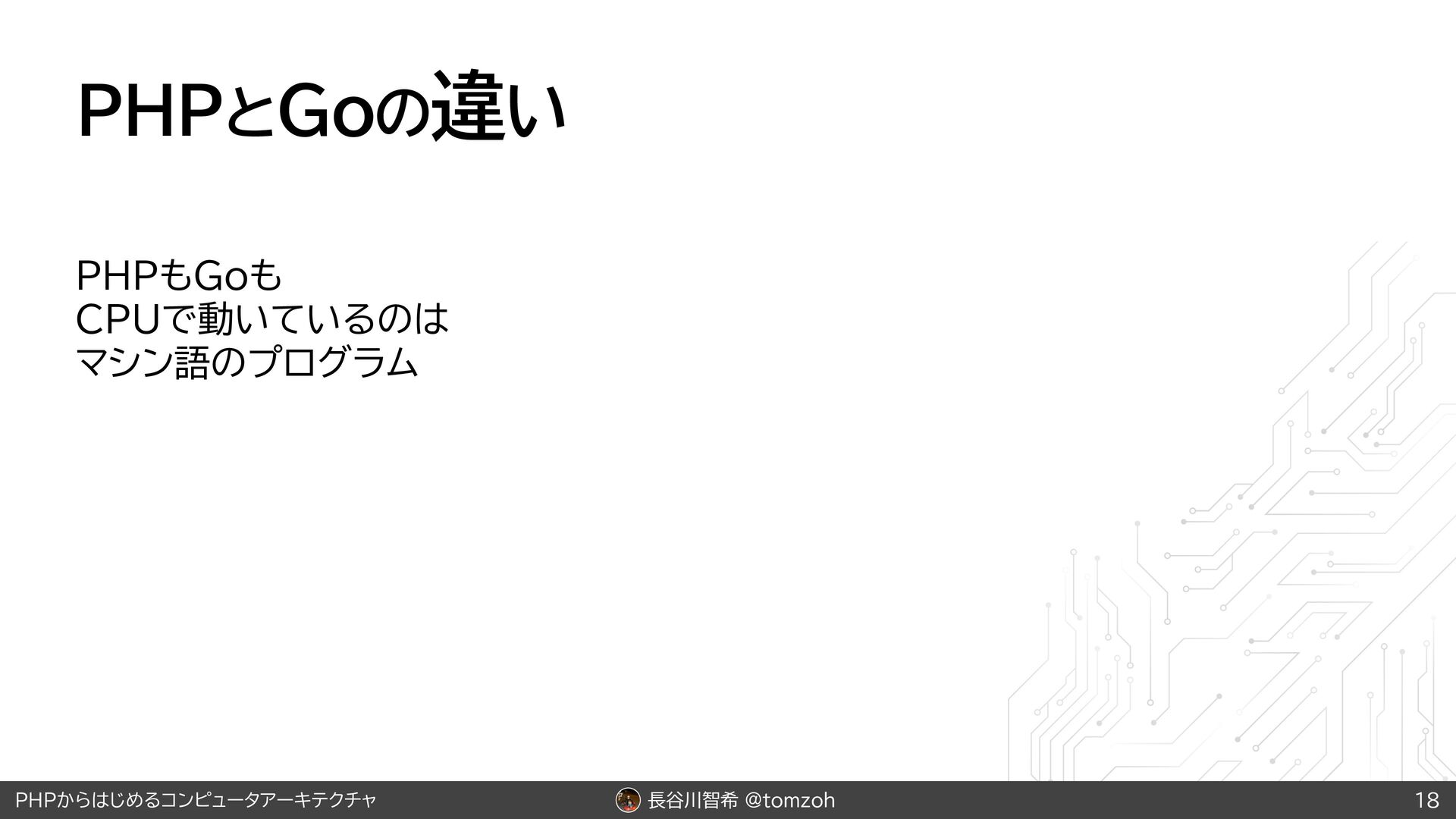 → マシン語(バイナリ) CPUで実行 $ ./hello-world 55 #include <stdio.h> int main(void){ printf("Hello, world."); } hello-world.c .LC0: .string "Hello, world." : main: endbr64 pushq %rbp movq %rsp, %rbp leaq .LC0(%rip), %rdi movl $0, %eax call printf@PLT movl $0, %eax : hello-world.s 00000000 7f 45 4c 46 02 01 01 00 00 00 00 00 00 00 00 00 |.ELF............| 00000010 03 00 3e 00 01 00 00 00 60 10 00 00 00 00 00 00 |..>.....`.......| 00000020 40 00 00 00 00 00 00 00 80 39 00 00 00 00 00 00 |@........9......| : hello-world