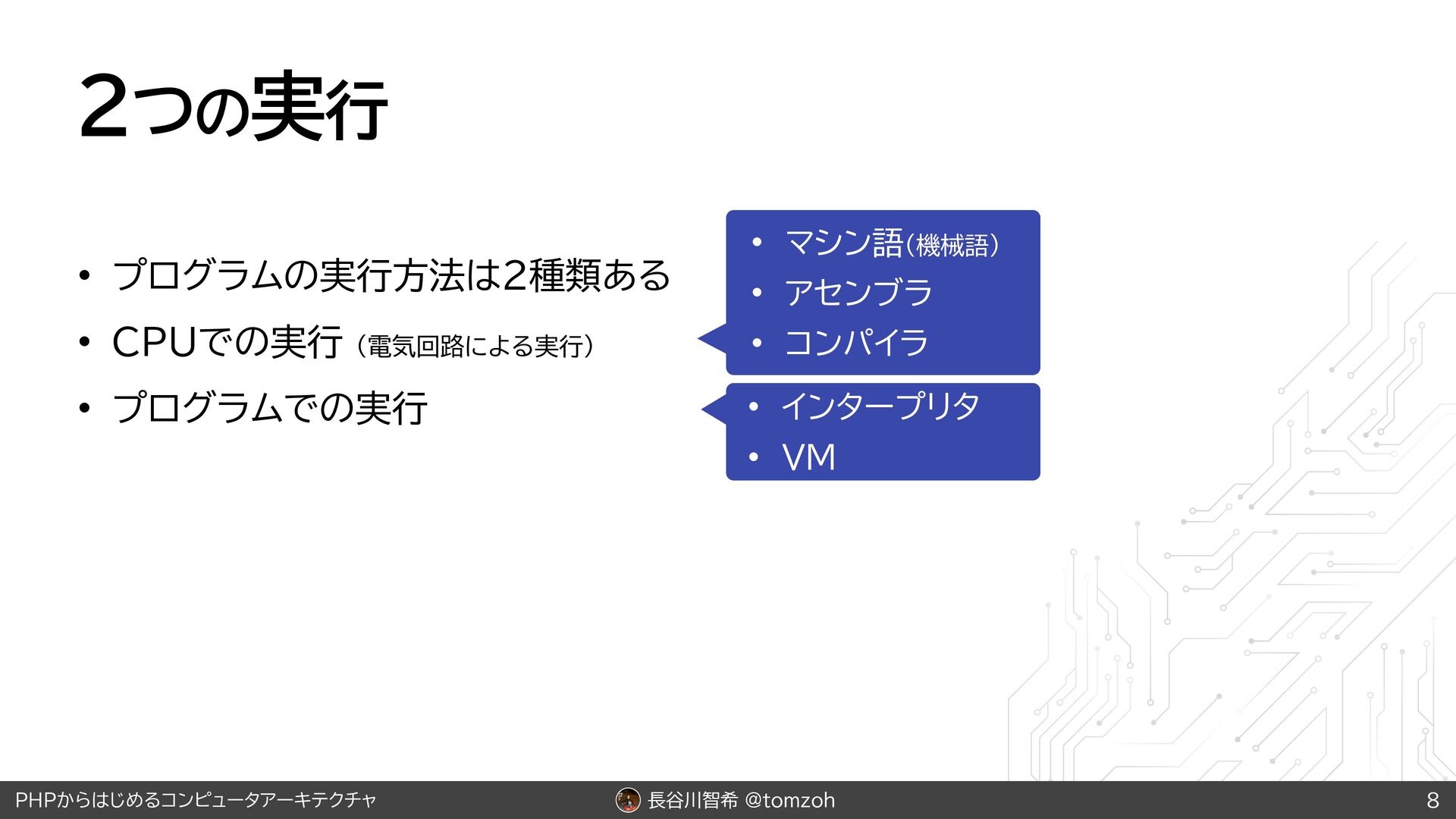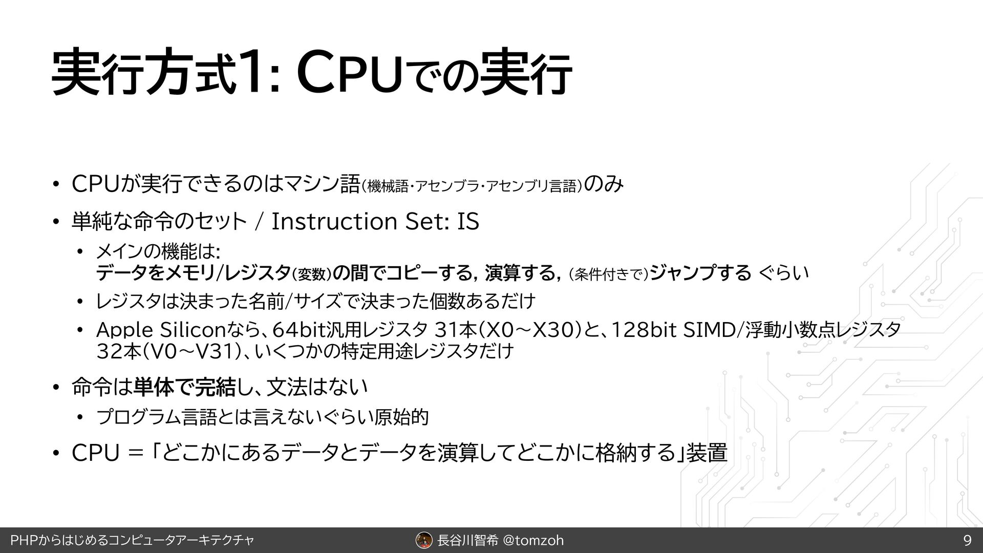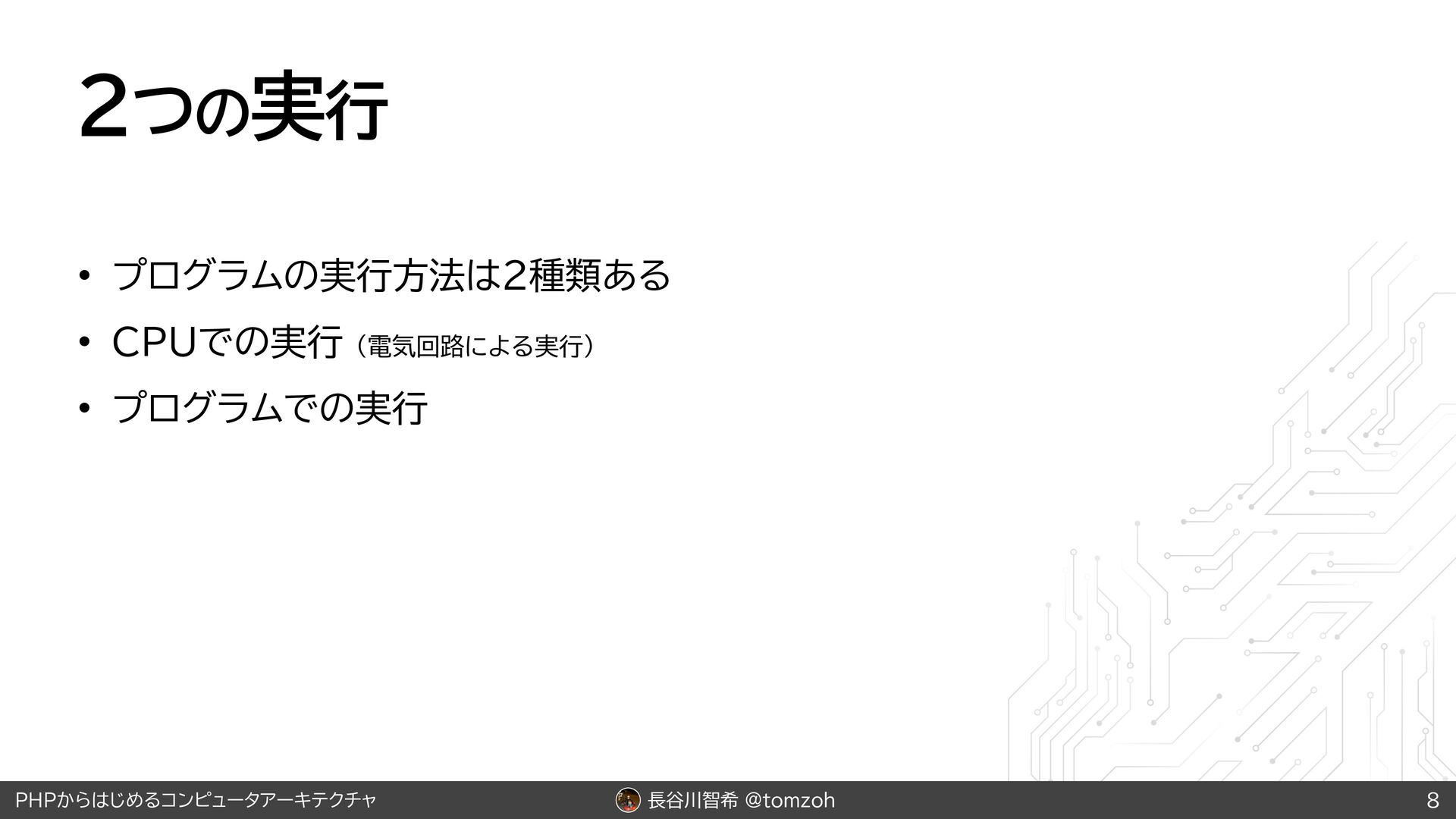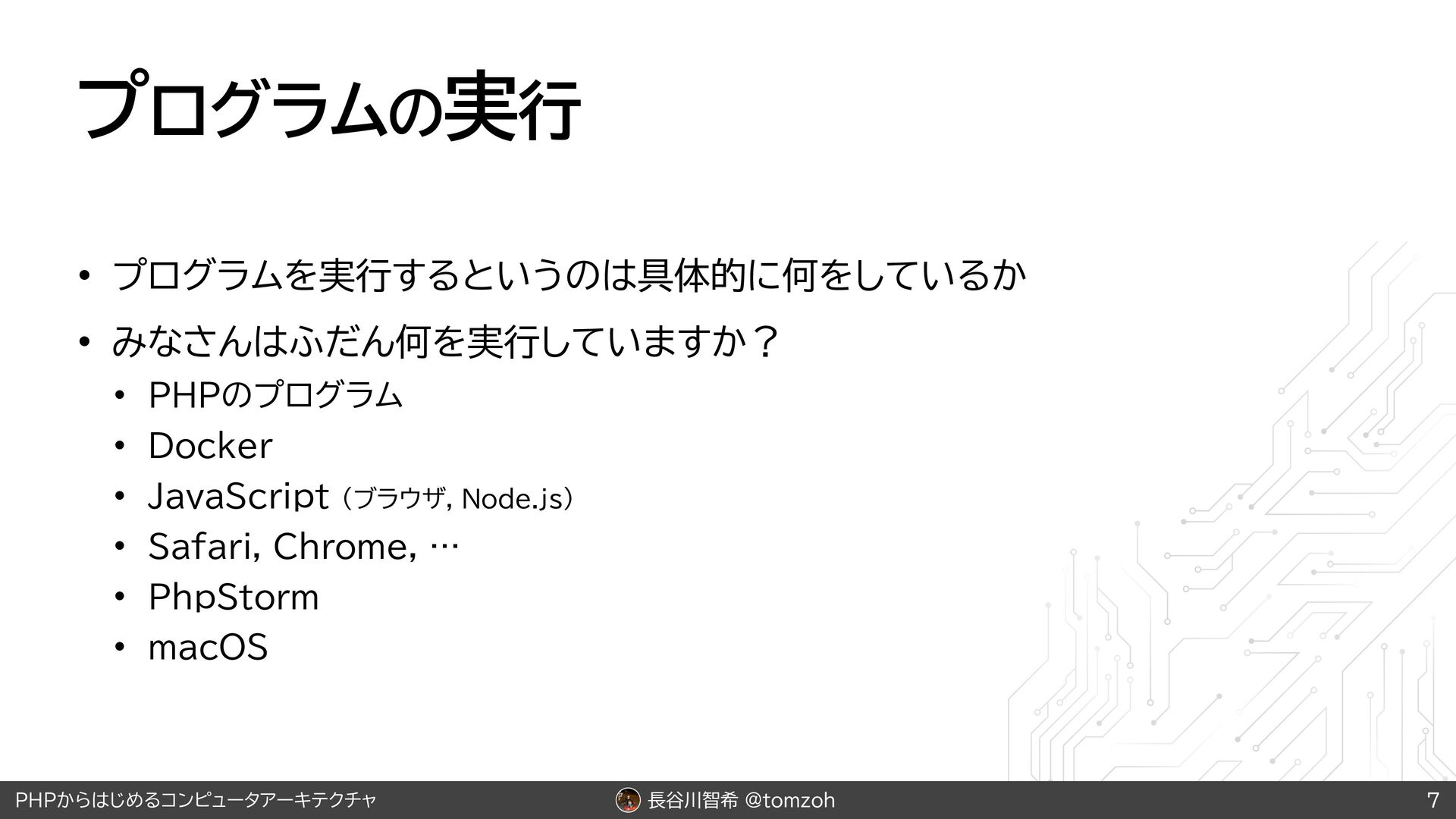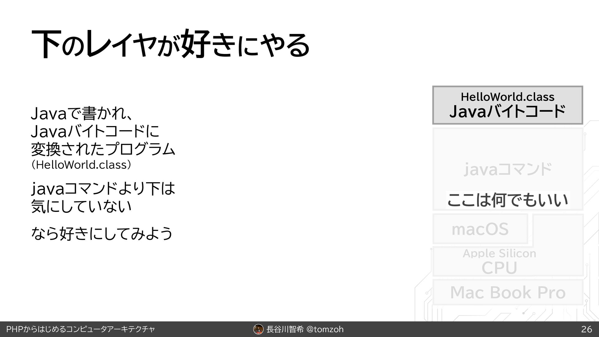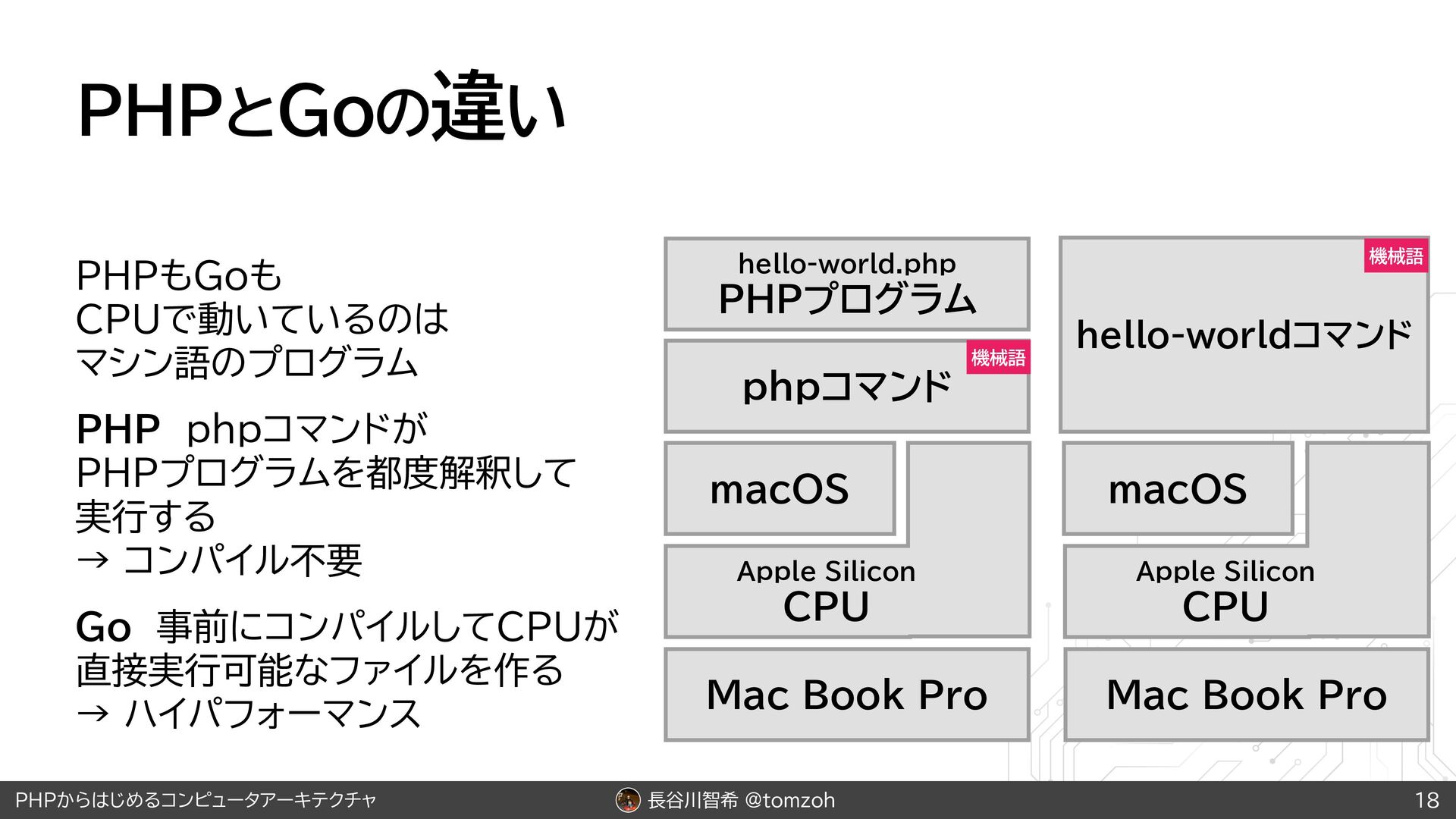 → マシン語(バイナリ) CPUで実行 $ ./hello-world 55 #include <stdio.h> int main(void){ printf("Hello, world."); } hello-world.c .LC0: .string "Hello, world." : main: endbr64 pushq %rbp movq %rsp, %rbp leaq .LC0(%rip), %rdi movl $0, %eax call printf@PLT movl $0, %eax : hello-world.s 00000000 7f 45 4c 46 02 01 01 00 00 00 00 00 00 00 00 00 |.ELF............| 00000010 03 00 3e 00 01 00 00 00 60 10 00 00 00 00 00 00 |..>.....`.......| 00000020 40 00 00 00 00 00 00 00 80 39 00 00 00 00 00 00 |@........9......| : hello-world