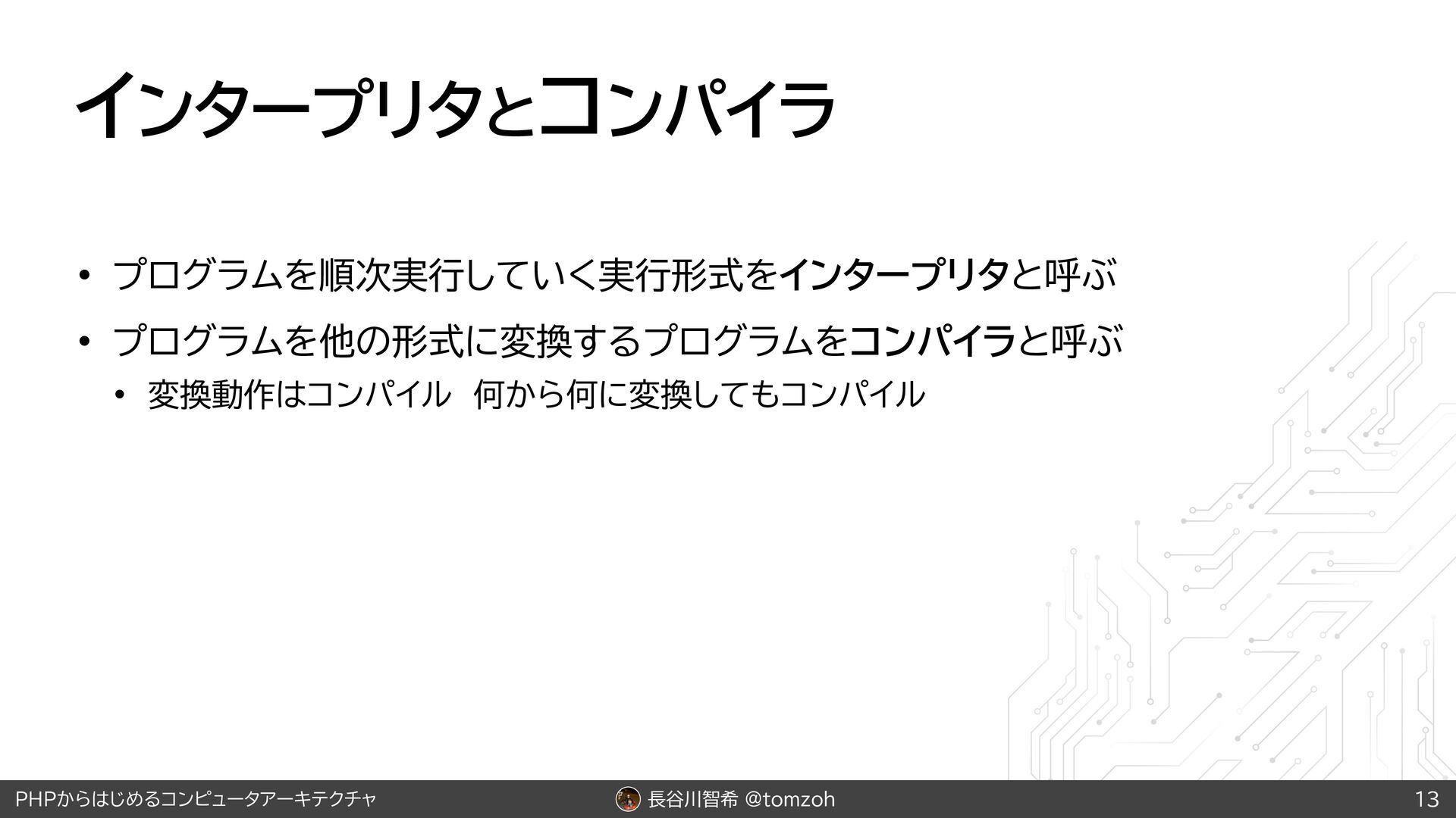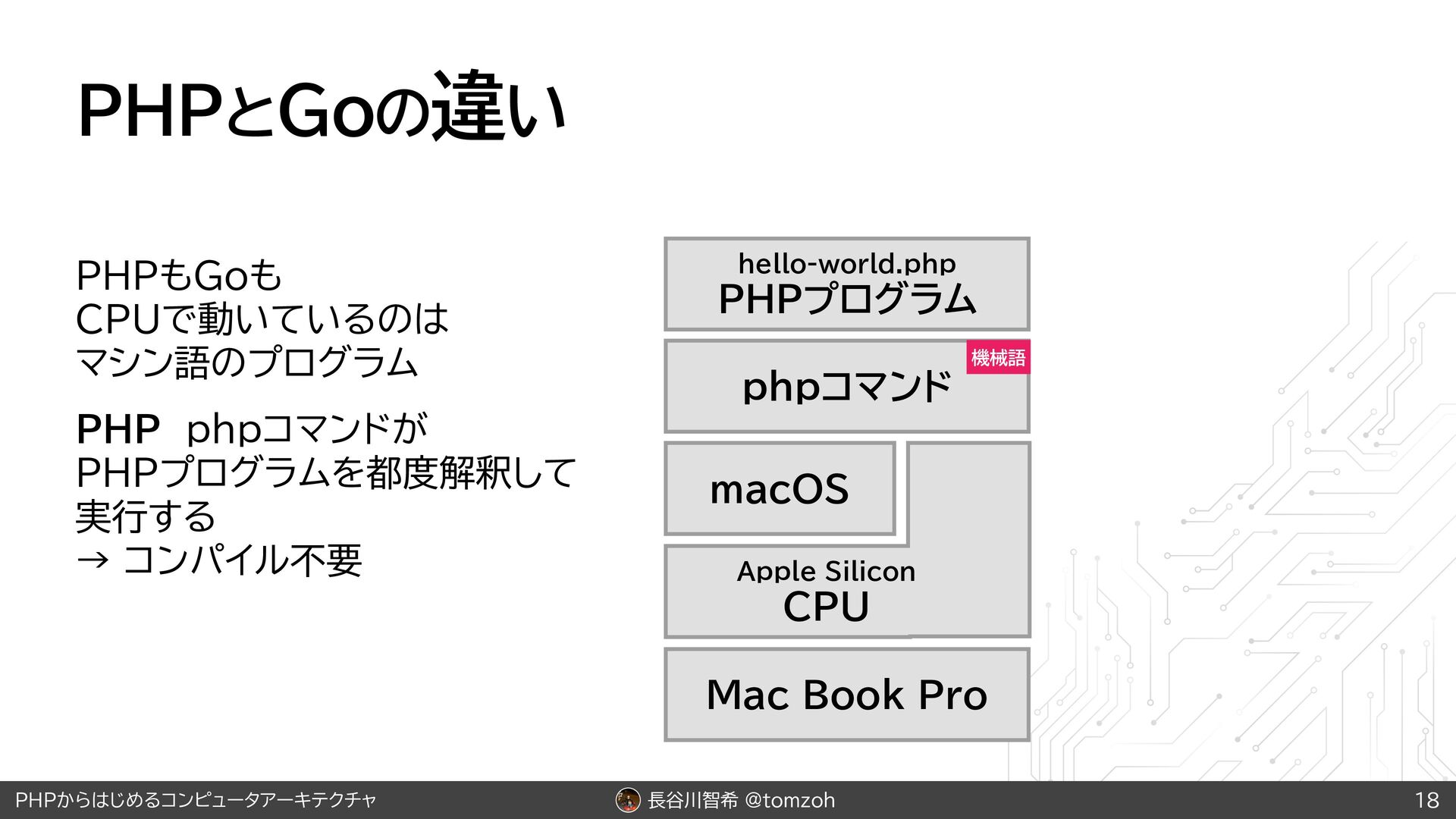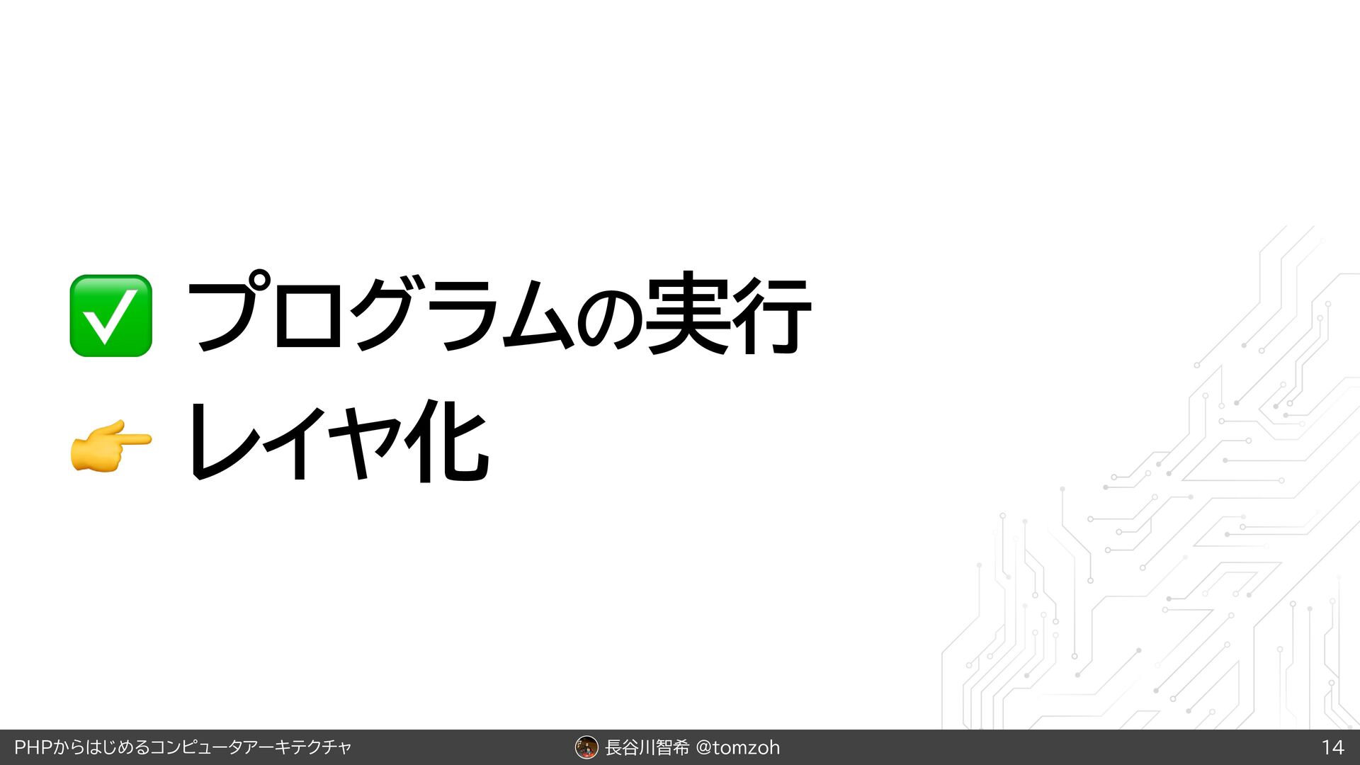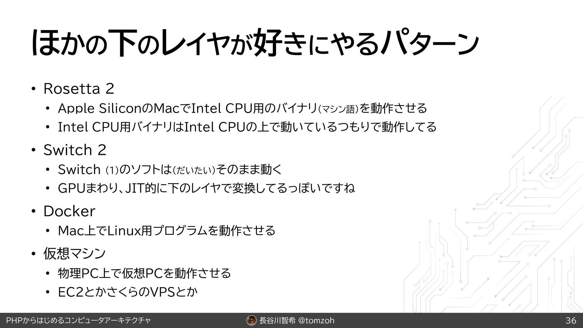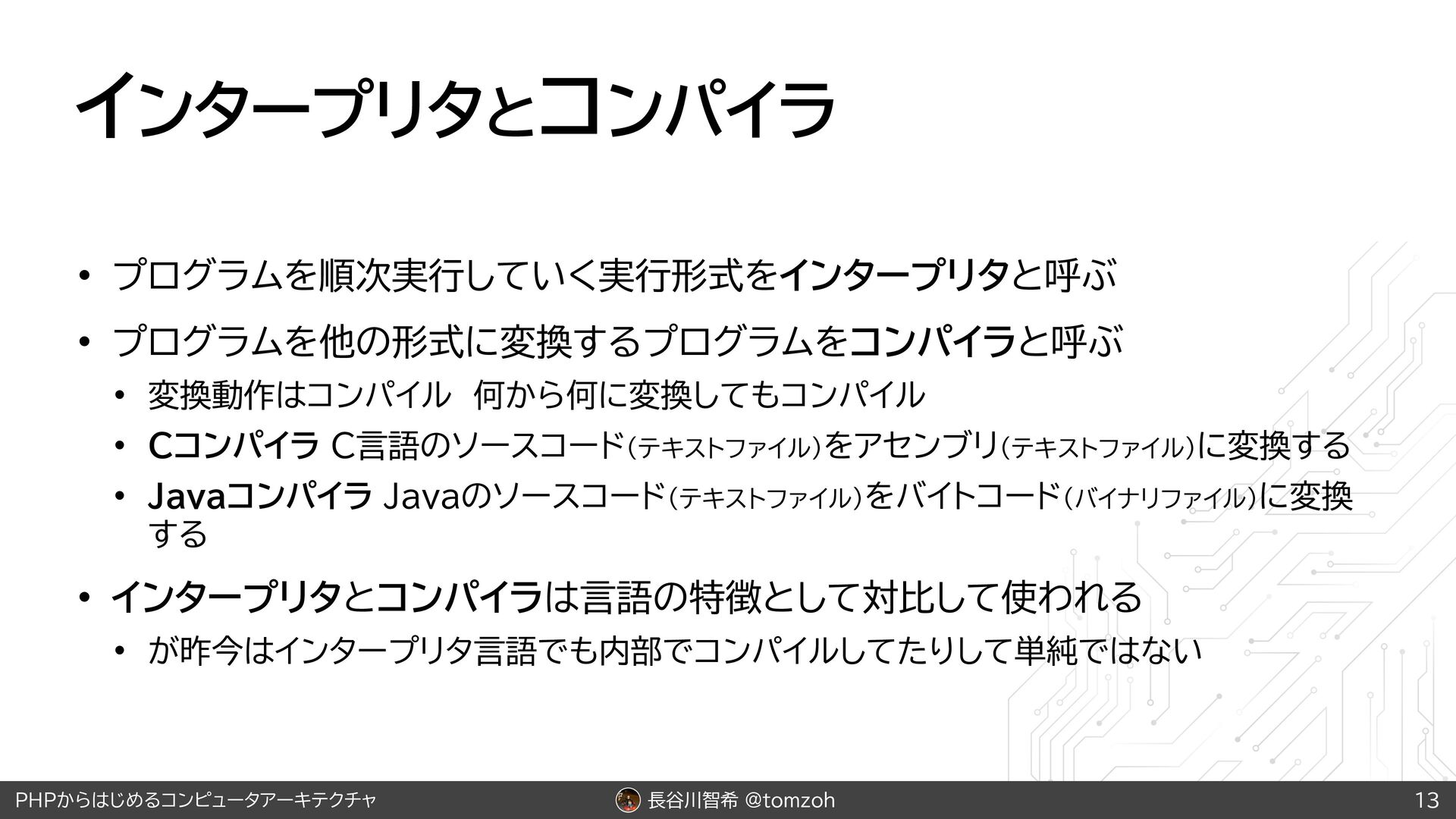 → マシン語(バイナリ) CPUで実行 $ ./hello-world 55 #include <stdio.h> int main(void){ printf("Hello, world."); } hello-world.c .LC0: .string "Hello, world." : main: endbr64 pushq %rbp movq %rsp, %rbp leaq .LC0(%rip), %rdi movl $0, %eax call printf@PLT movl $0, %eax : hello-world.s 00000000 7f 45 4c 46 02 01 01 00 00 00 00 00 00 00 00 00 |.ELF............| 00000010 03 00 3e 00 01 00 00 00 60 10 00 00 00 00 00 00 |..>.....`.......| 00000020 40 00 00 00 00 00 00 00 80 39 00 00 00 00 00 00 |@........9......| : hello-world