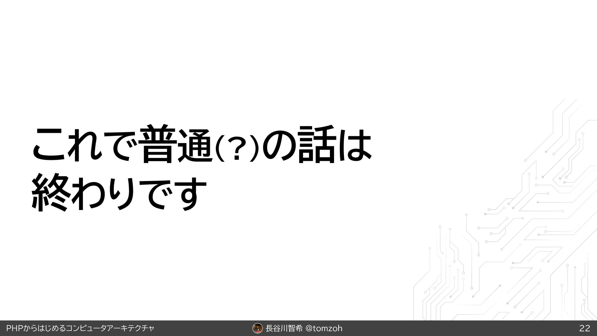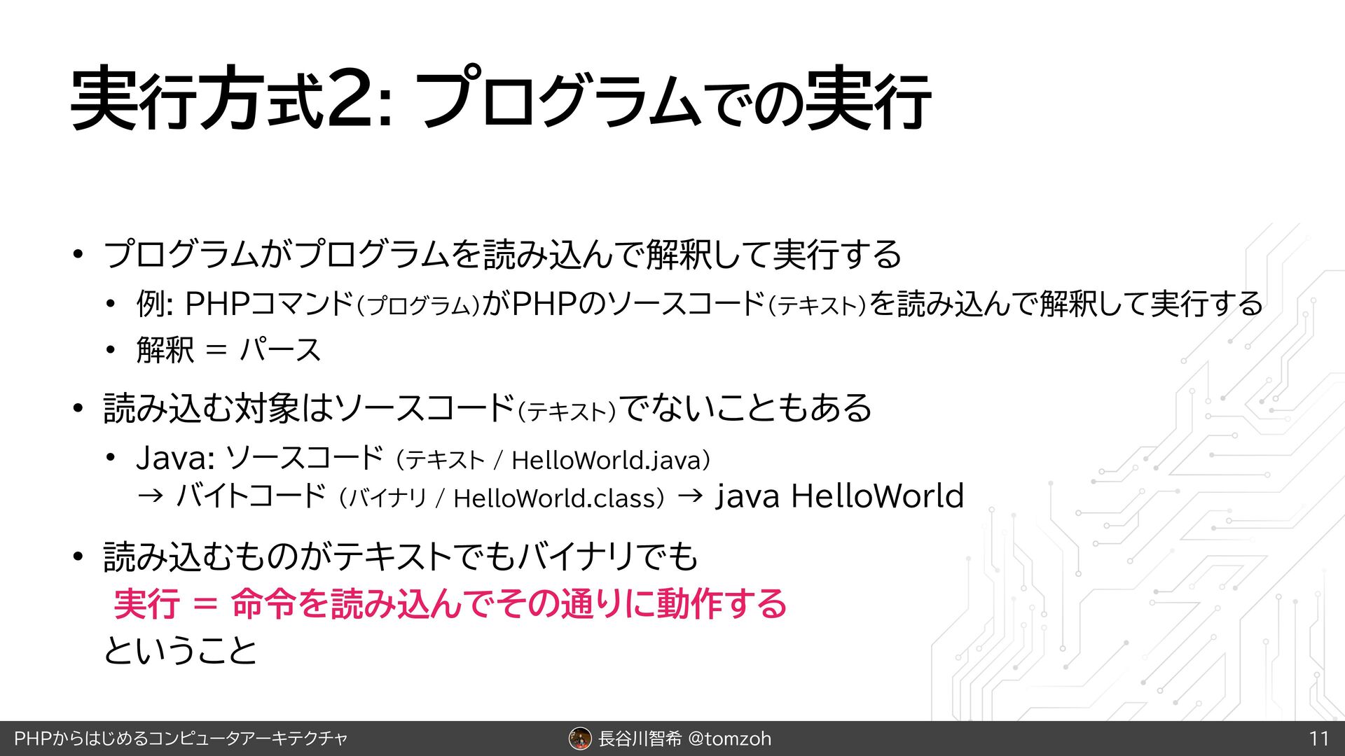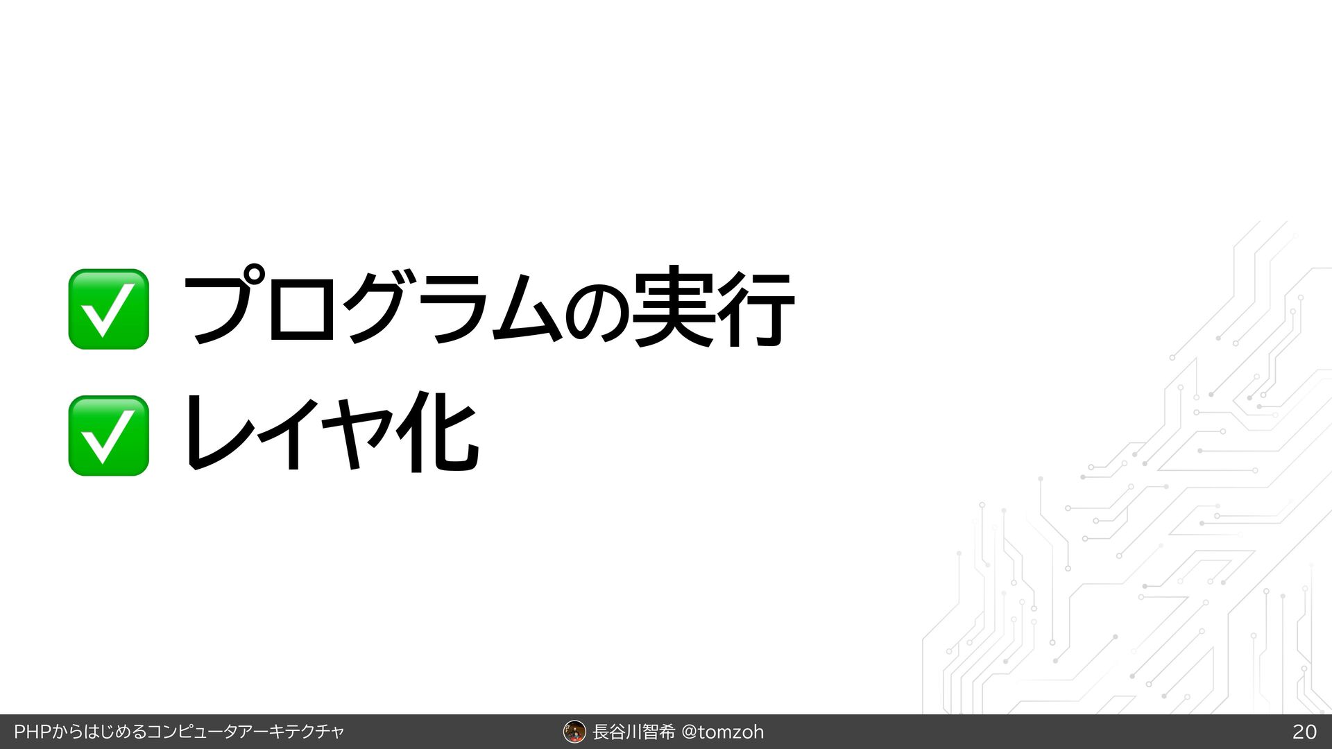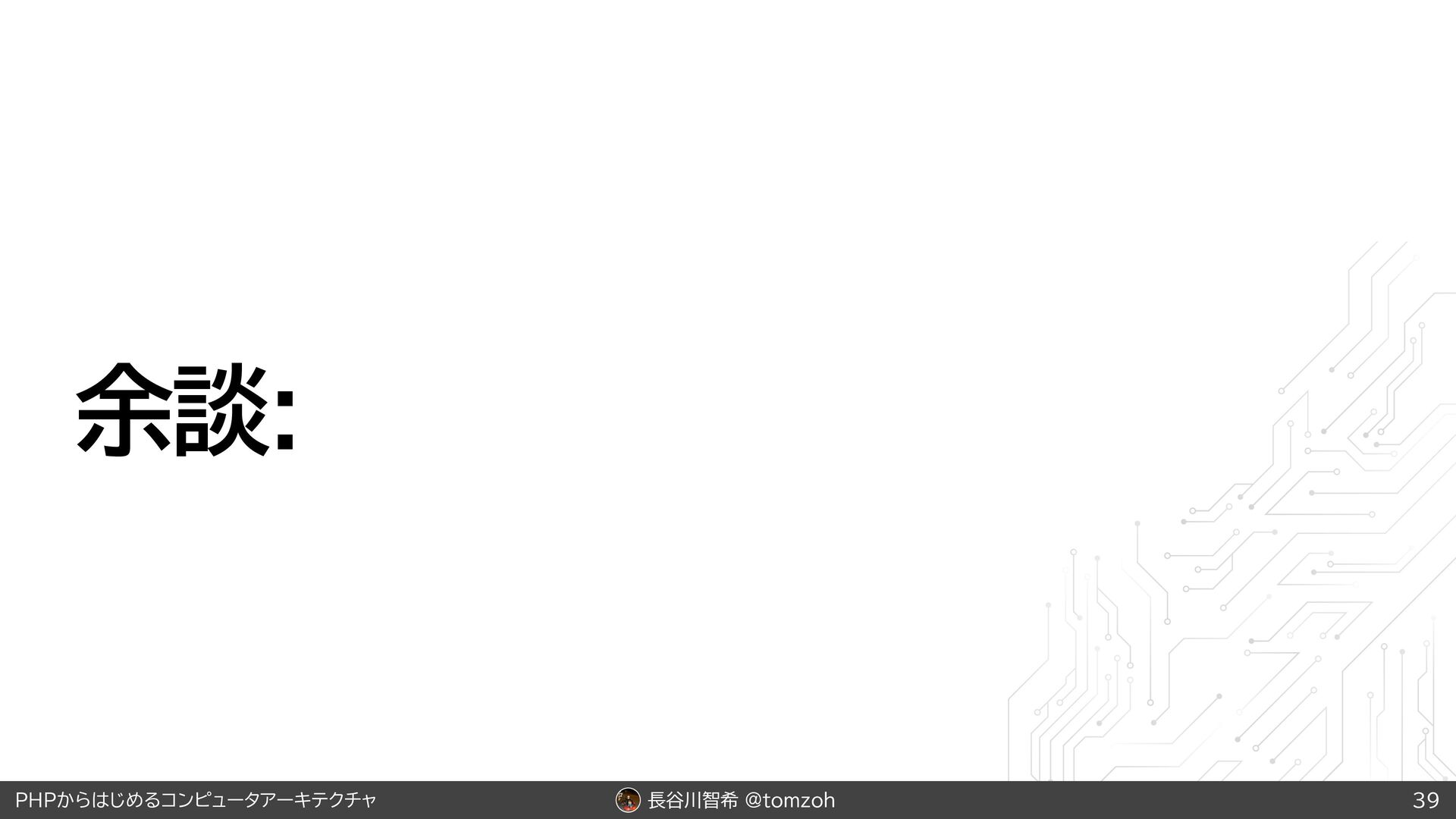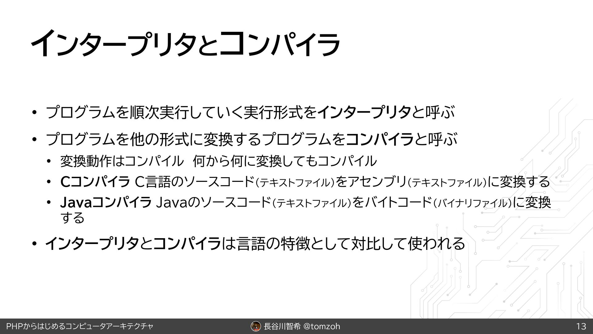 → マシン語(バイナリ) CPUで実行 $ ./hello-world 55 #include <stdio.h> int main(void){ printf("Hello, world."); } hello-world.c .LC0: .string "Hello, world." : main: endbr64 pushq %rbp movq %rsp, %rbp leaq .LC0(%rip), %rdi movl $0, %eax call printf@PLT movl $0, %eax : hello-world.s 00000000 7f 45 4c 46 02 01 01 00 00 00 00 00 00 00 00 00 |.ELF............| 00000010 03 00 3e 00 01 00 00 00 60 10 00 00 00 00 00 00 |..>.....`.......| 00000020 40 00 00 00 00 00 00 00 80 39 00 00 00 00 00 00 |@........9......| : hello-world