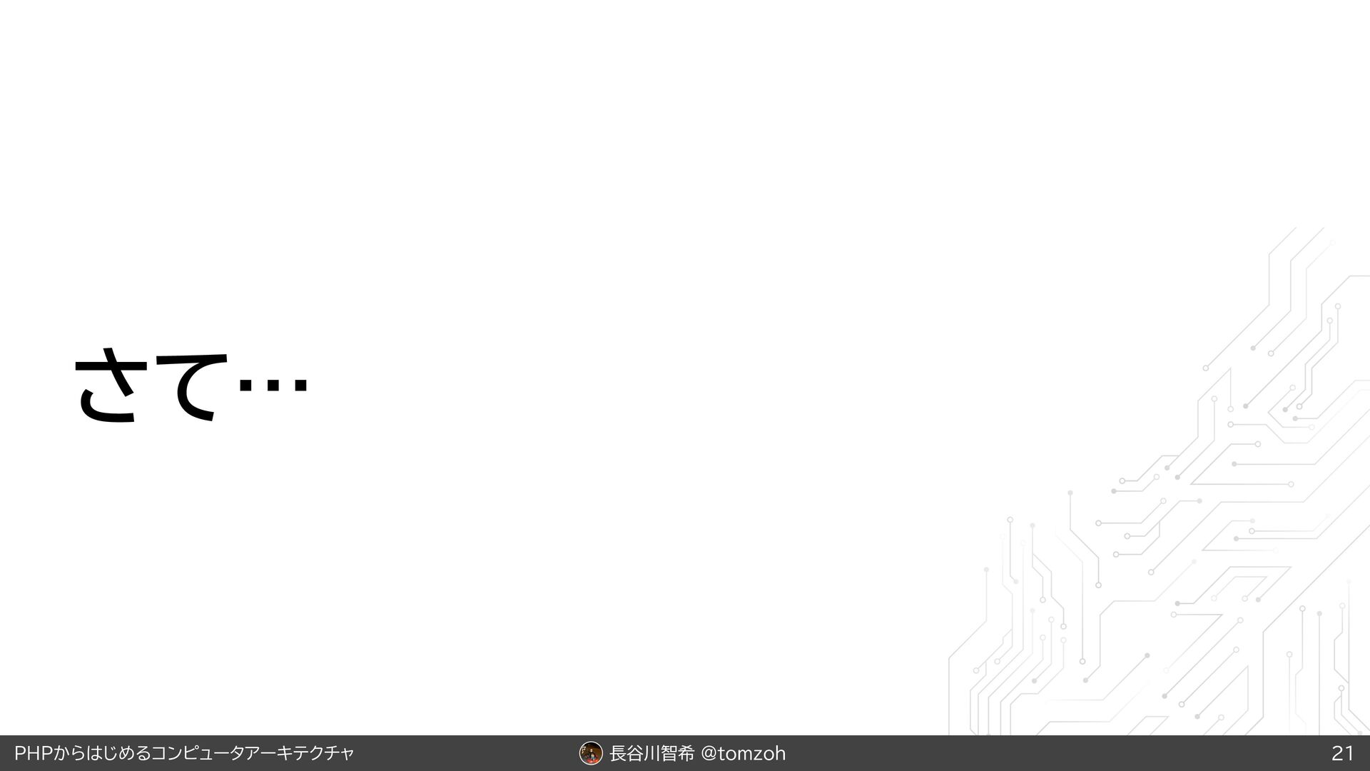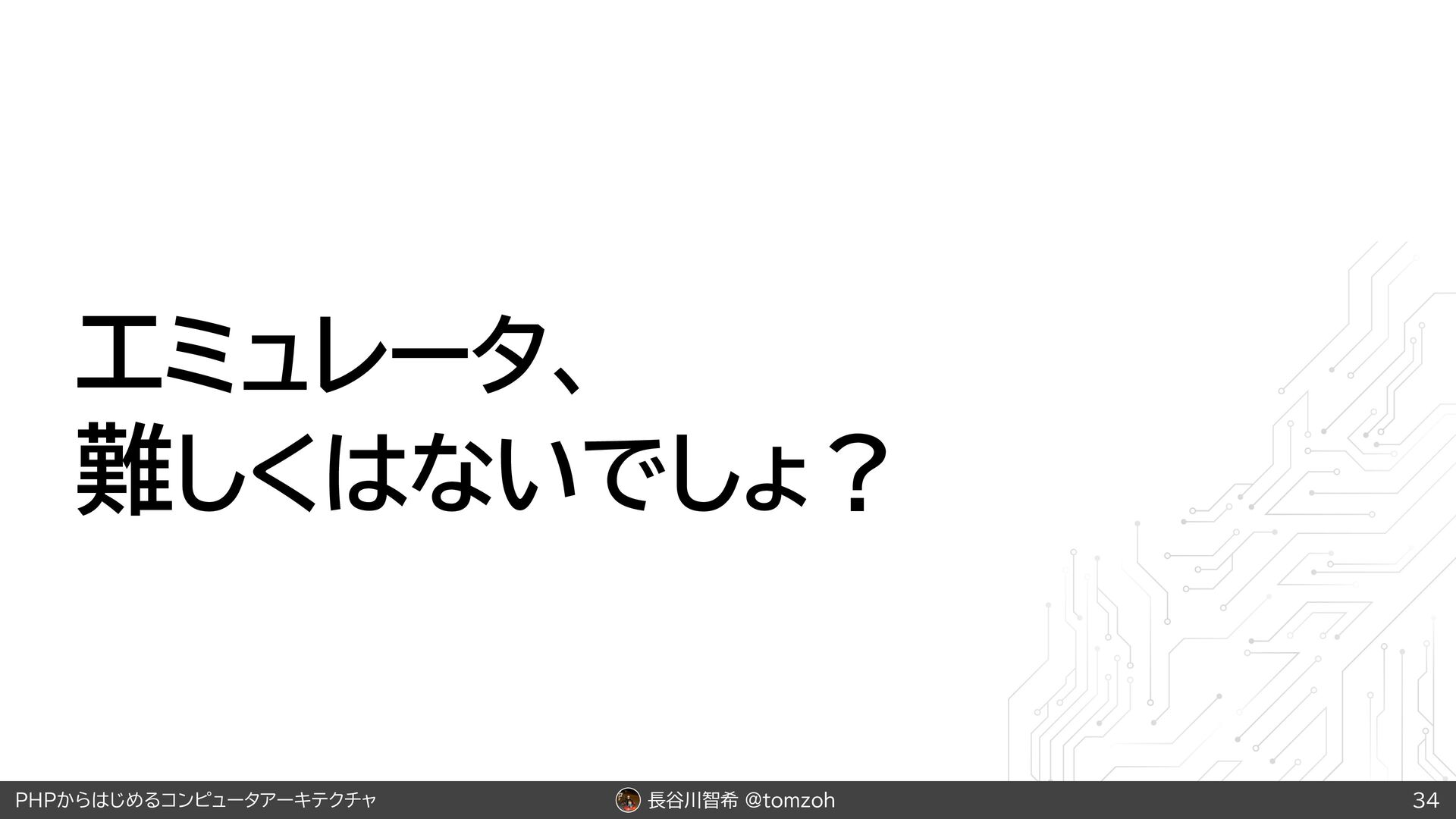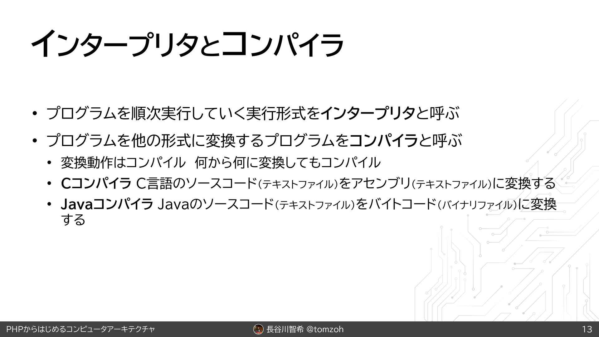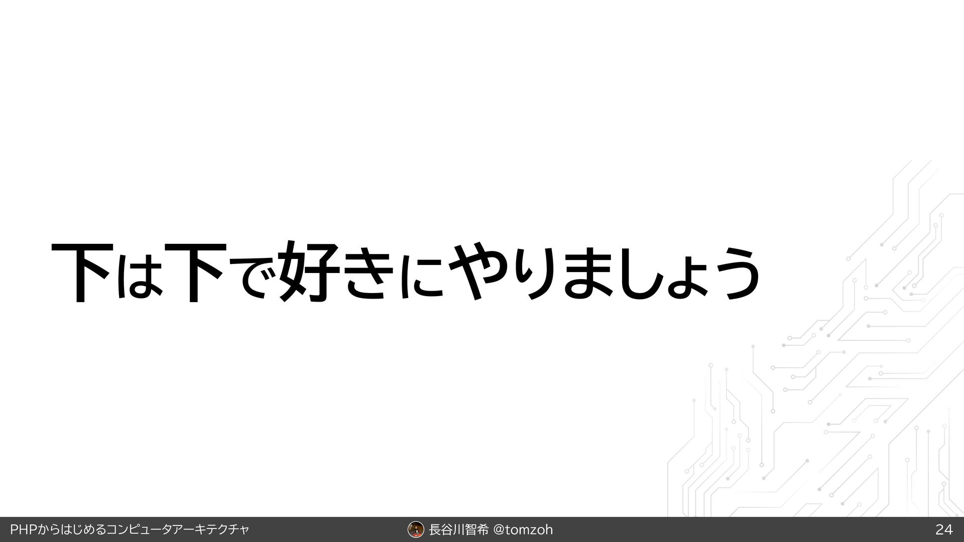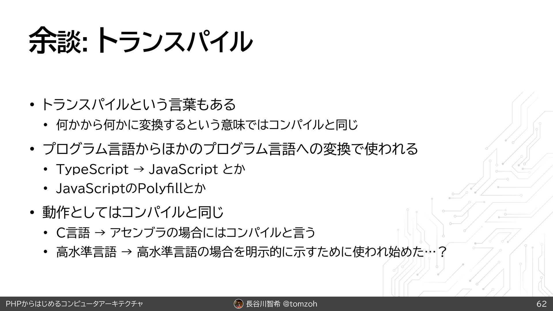 → マシン語(バイナリ) CPUで実行 $ ./hello-world 55 #include <stdio.h> int main(void){ printf("Hello, world."); } hello-world.c .LC0: .string "Hello, world." : main: endbr64 pushq %rbp movq %rsp, %rbp leaq .LC0(%rip), %rdi movl $0, %eax call printf@PLT movl $0, %eax : hello-world.s 00000000 7f 45 4c 46 02 01 01 00 00 00 00 00 00 00 00 00 |.ELF............| 00000010 03 00 3e 00 01 00 00 00 60 10 00 00 00 00 00 00 |..>.....`.......| 00000020 40 00 00 00 00 00 00 00 80 39 00 00 00 00 00 00 |@........9......| : hello-world
