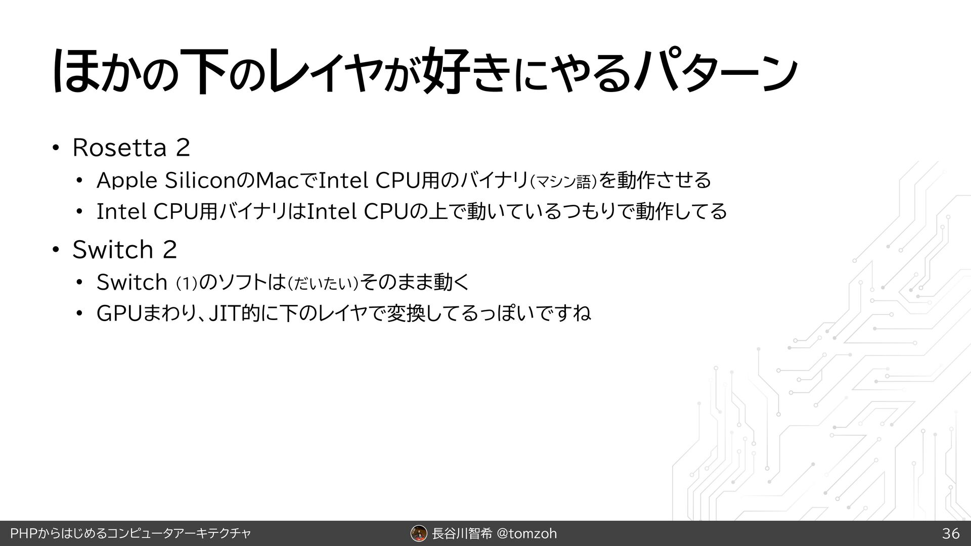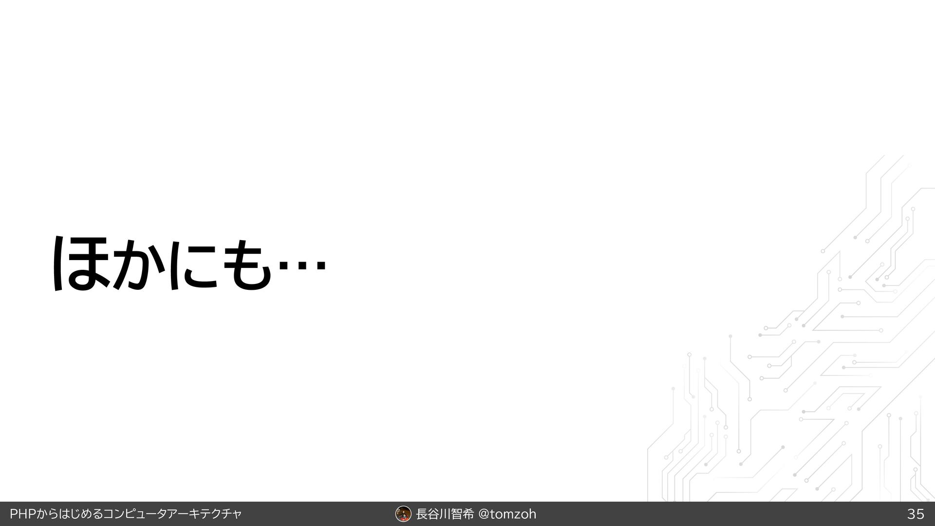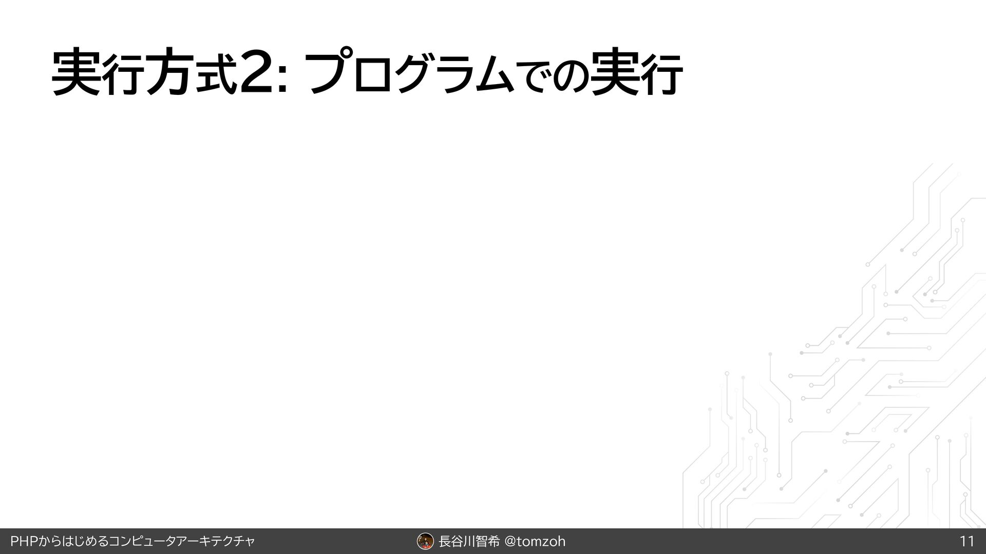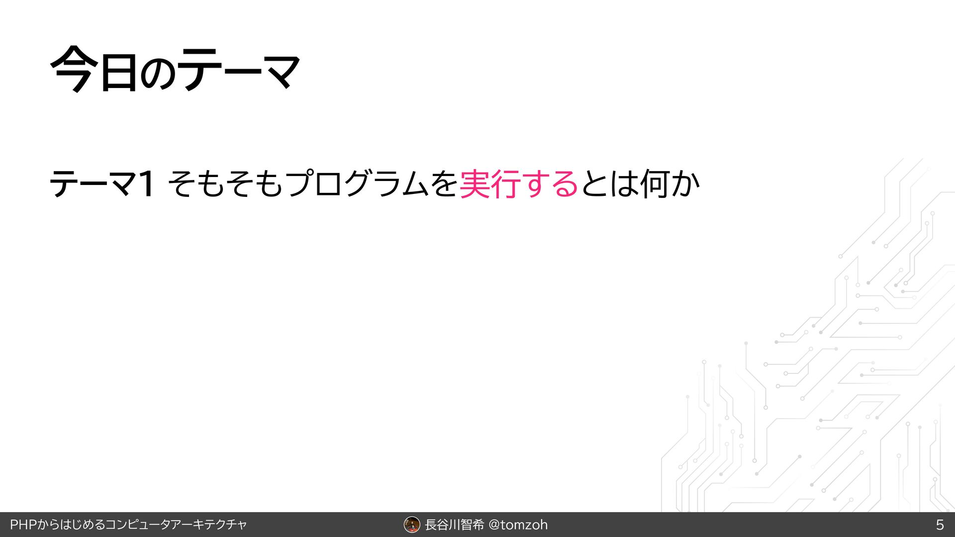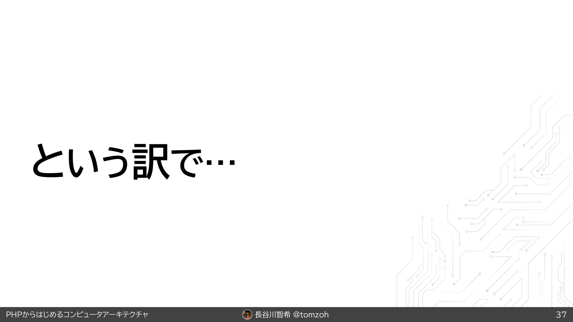 → マシン語(バイナリ) CPUで実行 $ ./hello-world 55 #include <stdio.h> int main(void){ printf("Hello, world."); } hello-world.c .LC0: .string "Hello, world." : main: endbr64 pushq %rbp movq %rsp, %rbp leaq .LC0(%rip), %rdi movl $0, %eax call printf@PLT movl $0, %eax : hello-world.s 00000000 7f 45 4c 46 02 01 01 00 00 00 00 00 00 00 00 00 |.ELF............| 00000010 03 00 3e 00 01 00 00 00 60 10 00 00 00 00 00 00 |..>.....`.......| 00000020 40 00 00 00 00 00 00 00 80 39 00 00 00 00 00 00 |@........9......| : hello-world