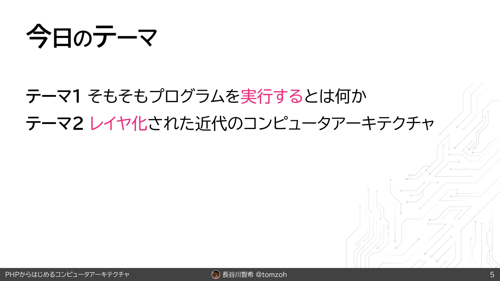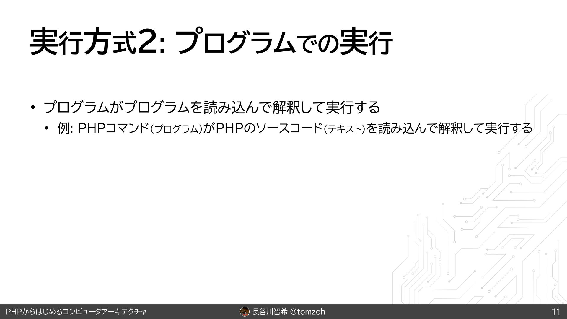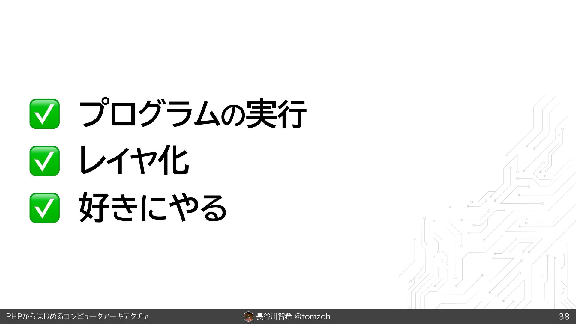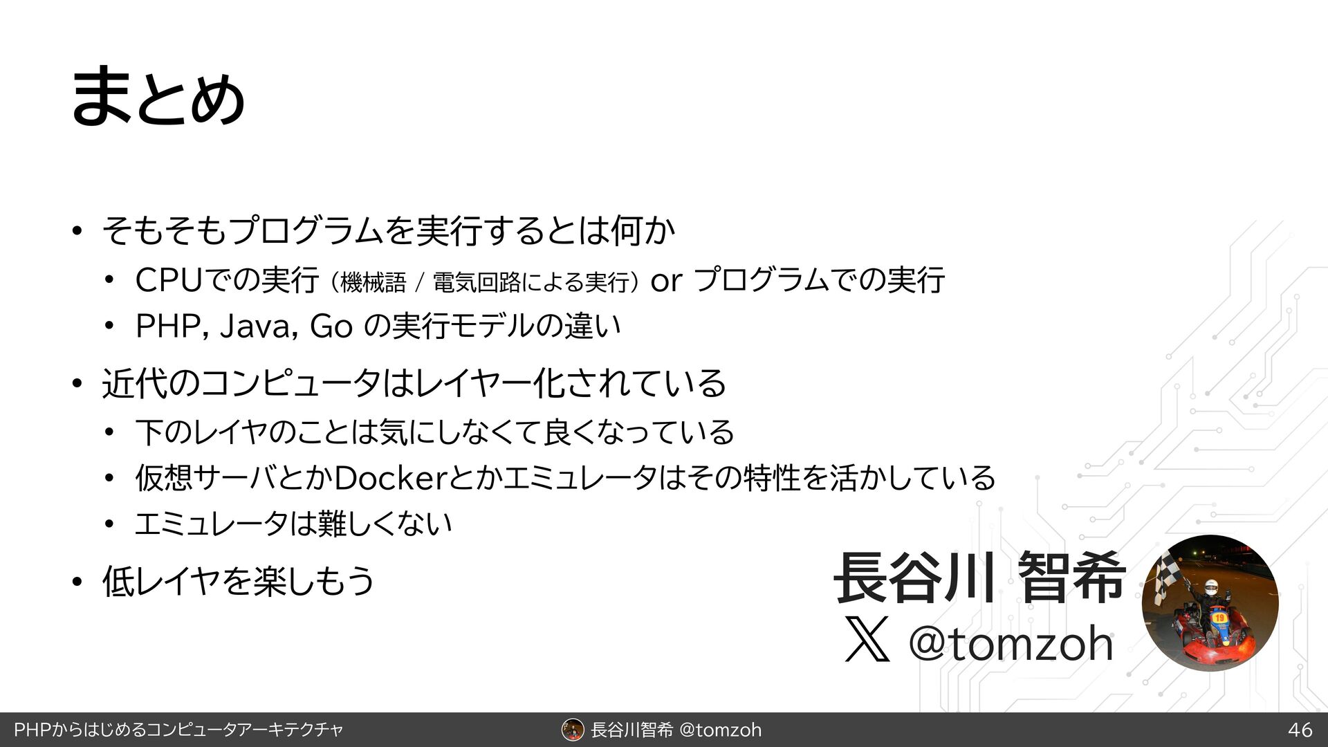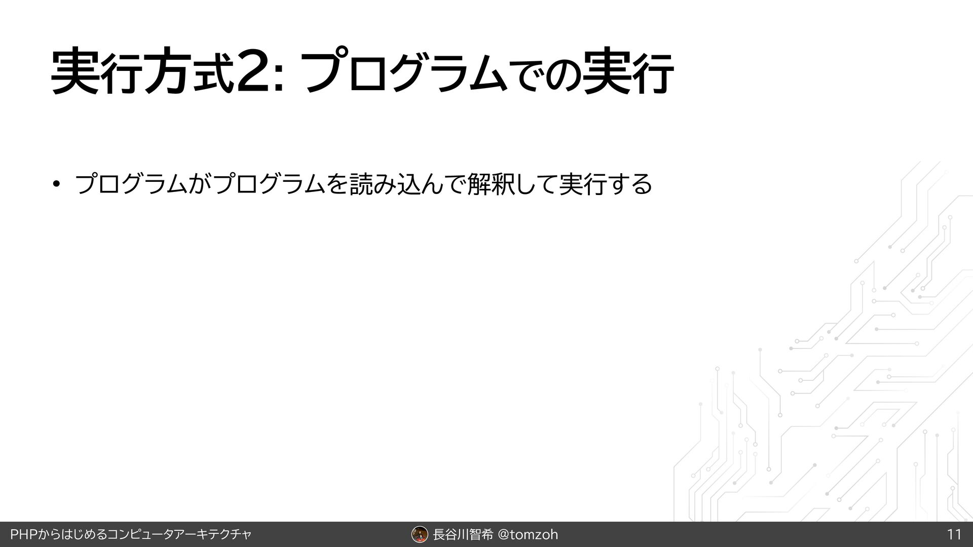 → マシン語(バイナリ) CPUで実行 $ ./hello-world 55 #include <stdio.h> int main(void){ printf("Hello, world."); } hello-world.c .LC0: .string "Hello, world." : main: endbr64 pushq %rbp movq %rsp, %rbp leaq .LC0(%rip), %rdi movl $0, %eax call printf@PLT movl $0, %eax : hello-world.s 00000000 7f 45 4c 46 02 01 01 00 00 00 00 00 00 00 00 00 |.ELF............| 00000010 03 00 3e 00 01 00 00 00 60 10 00 00 00 00 00 00 |..>.....`.......| 00000020 40 00 00 00 00 00 00 00 80 39 00 00 00 00 00 00 |@........9......| : hello-world