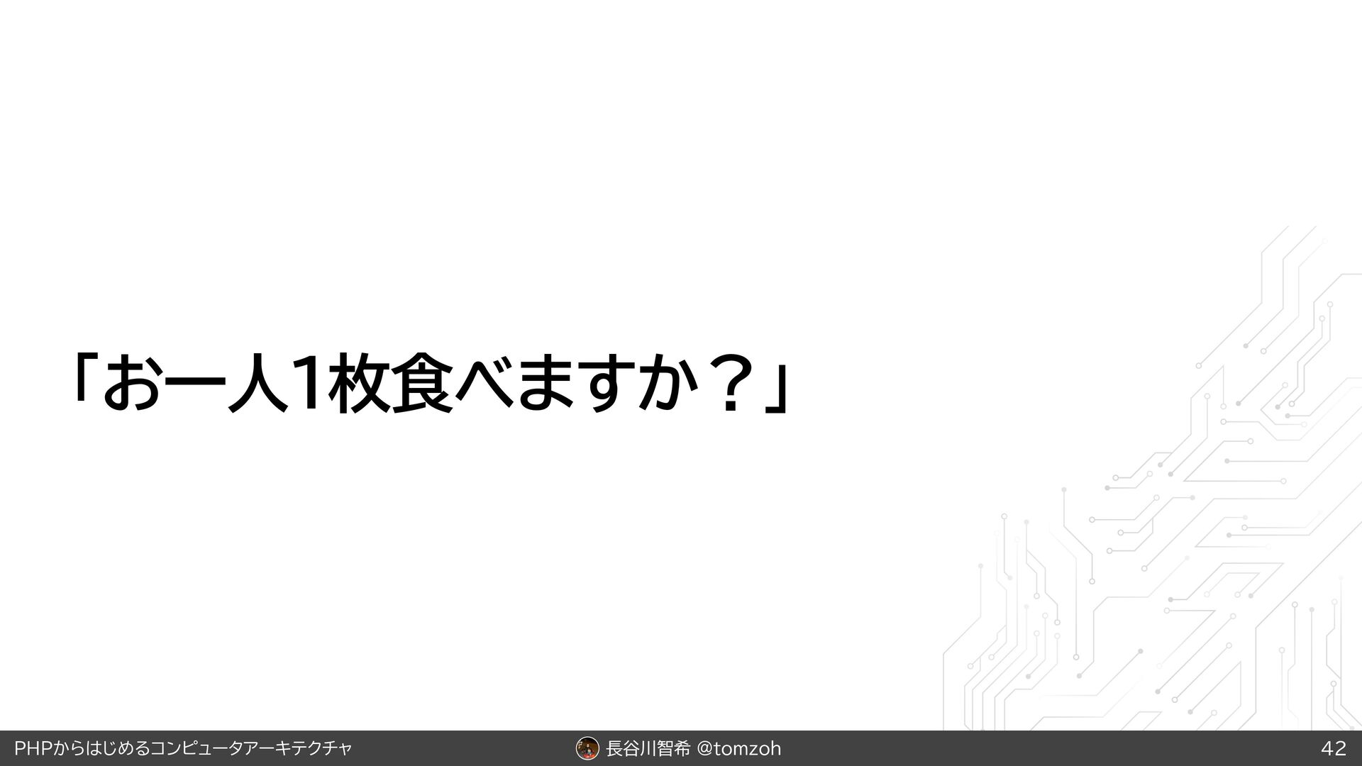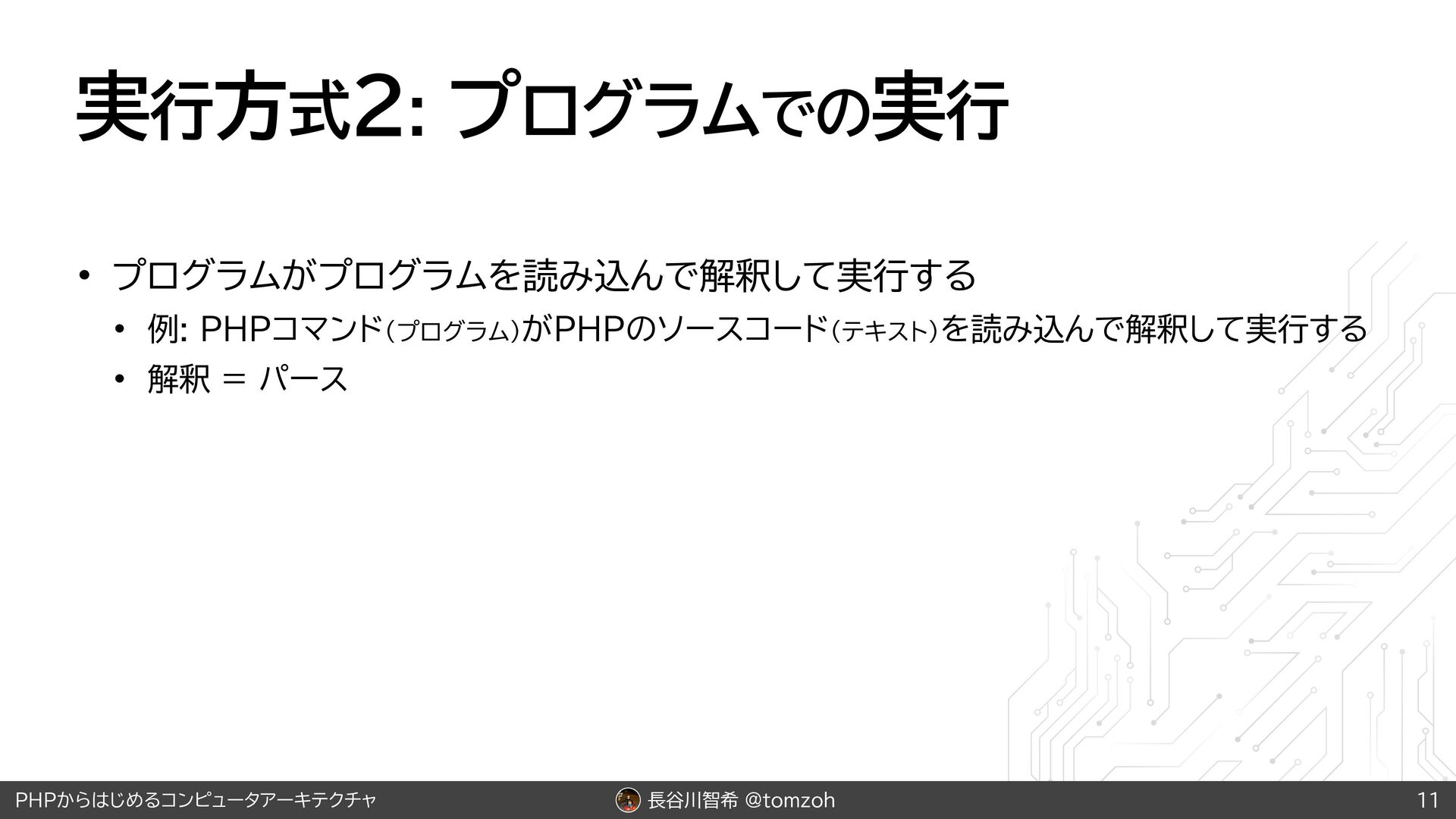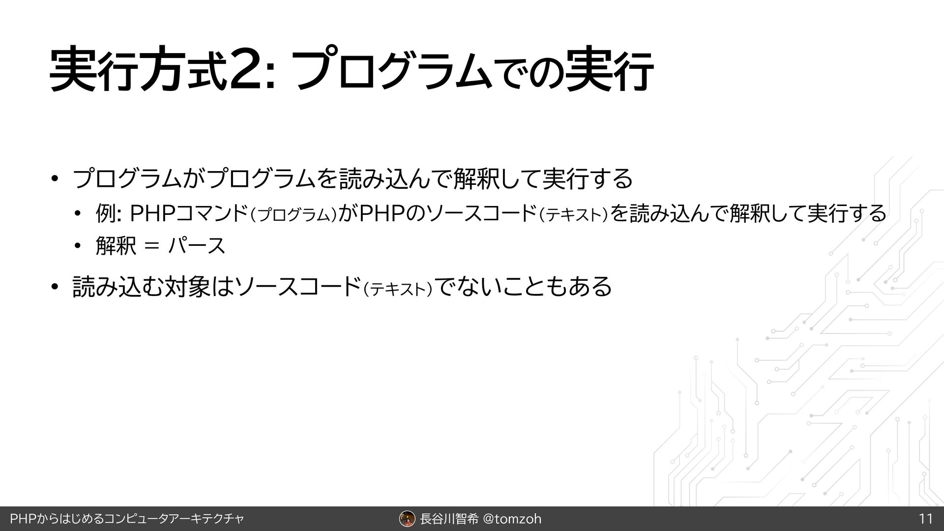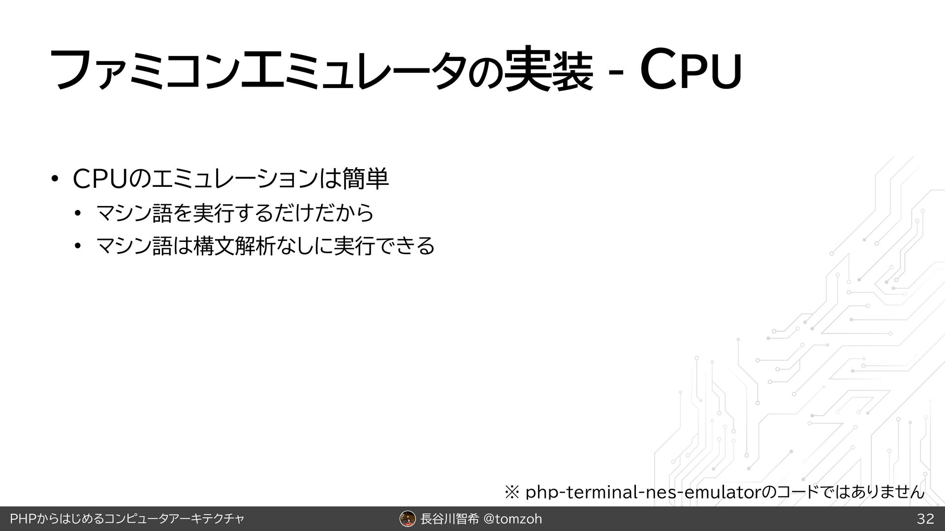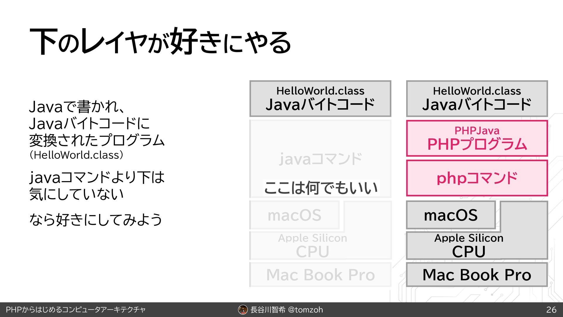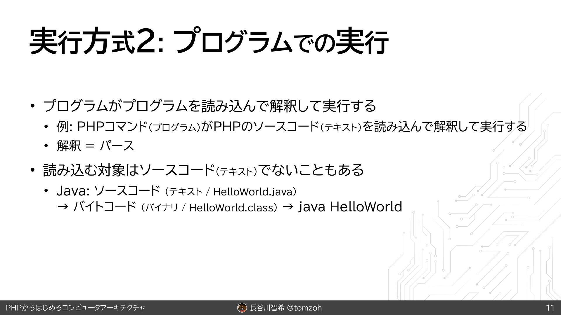 → マシン語(バイナリ) CPUで実行 $ ./hello-world 55 #include <stdio.h> int main(void){ printf("Hello, world."); } hello-world.c .LC0: .string "Hello, world." : main: endbr64 pushq %rbp movq %rsp, %rbp leaq .LC0(%rip), %rdi movl $0, %eax call printf@PLT movl $0, %eax : hello-world.s 00000000 7f 45 4c 46 02 01 01 00 00 00 00 00 00 00 00 00 |.ELF............| 00000010 03 00 3e 00 01 00 00 00 60 10 00 00 00 00 00 00 |..>.....`.......| 00000020 40 00 00 00 00 00 00 00 80 39 00 00 00 00 00 00 |@........9......| : hello-world