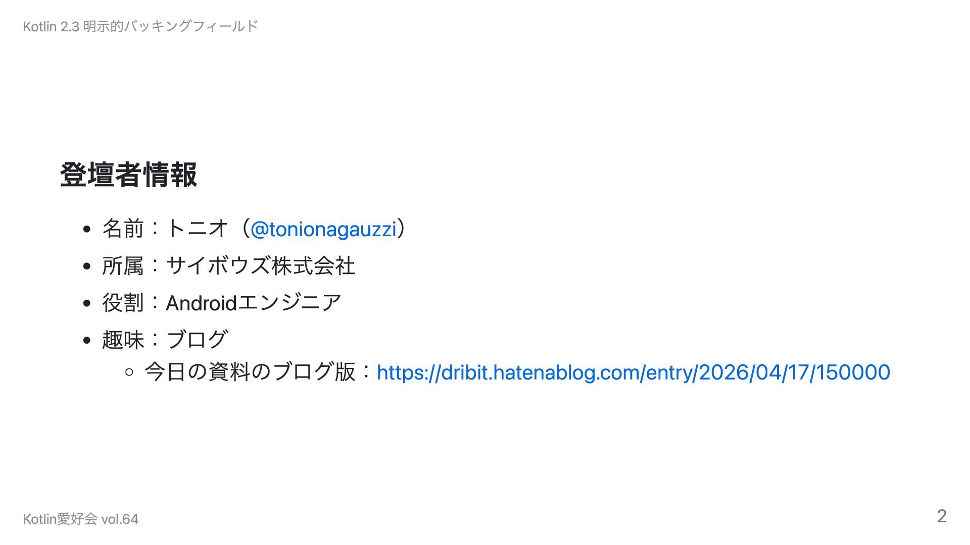 登壇者情報 名前:トニオ(@tonionagauzzi) 所属:サイボウズ株式会社 役割:Androidエンジニア 趣味:ブログ 今日の資料のブログ版:https://dribit.hatenablog.com/entry/2026/04/17/150000 Kotlin 2.3 明示的バッキングフィールド Kotlin愛好会