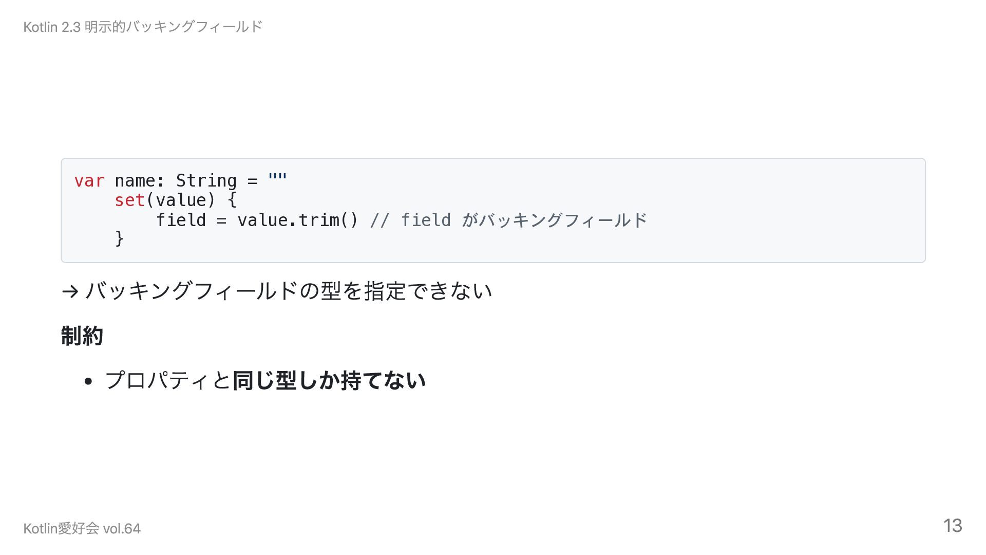 // field がバッキングフィールド } → バッキングフィールドの型を指定できない 制約 プロパティと同じ型しか持てない Kotlin 2.3 明示的バッキングフィールド Kotlin愛好会 vol.64 13