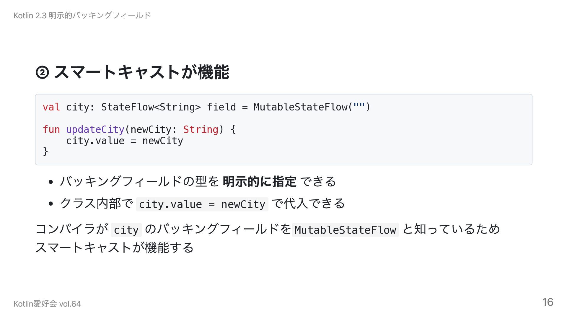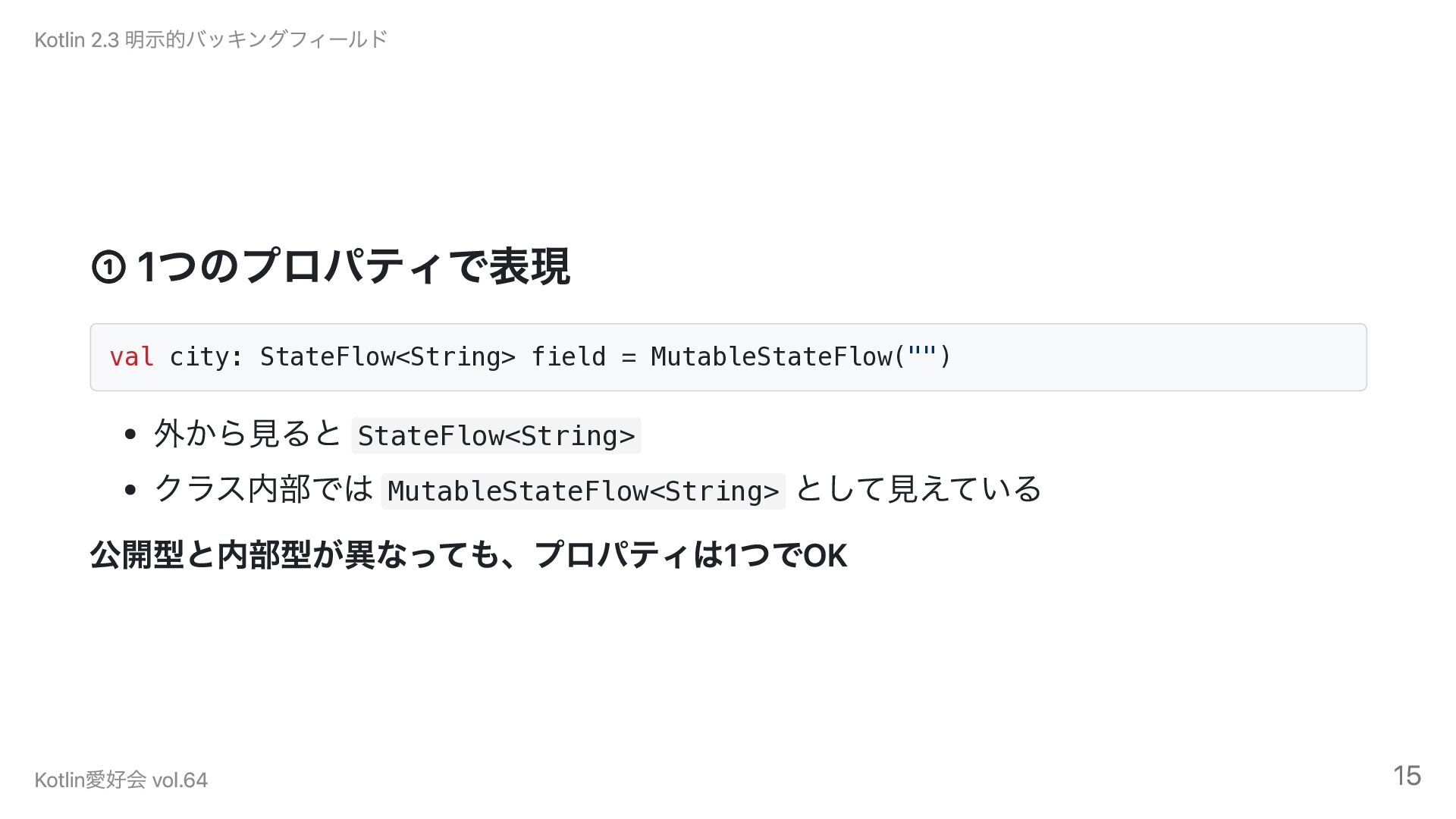 クラス内部では MutableStateFlow<String> として見えている 公開型と内部型が異なっても、プロパティは1つでOK Kotlin 2.3 明示的バッキングフィールド Kotlin愛好会 vol.64 15