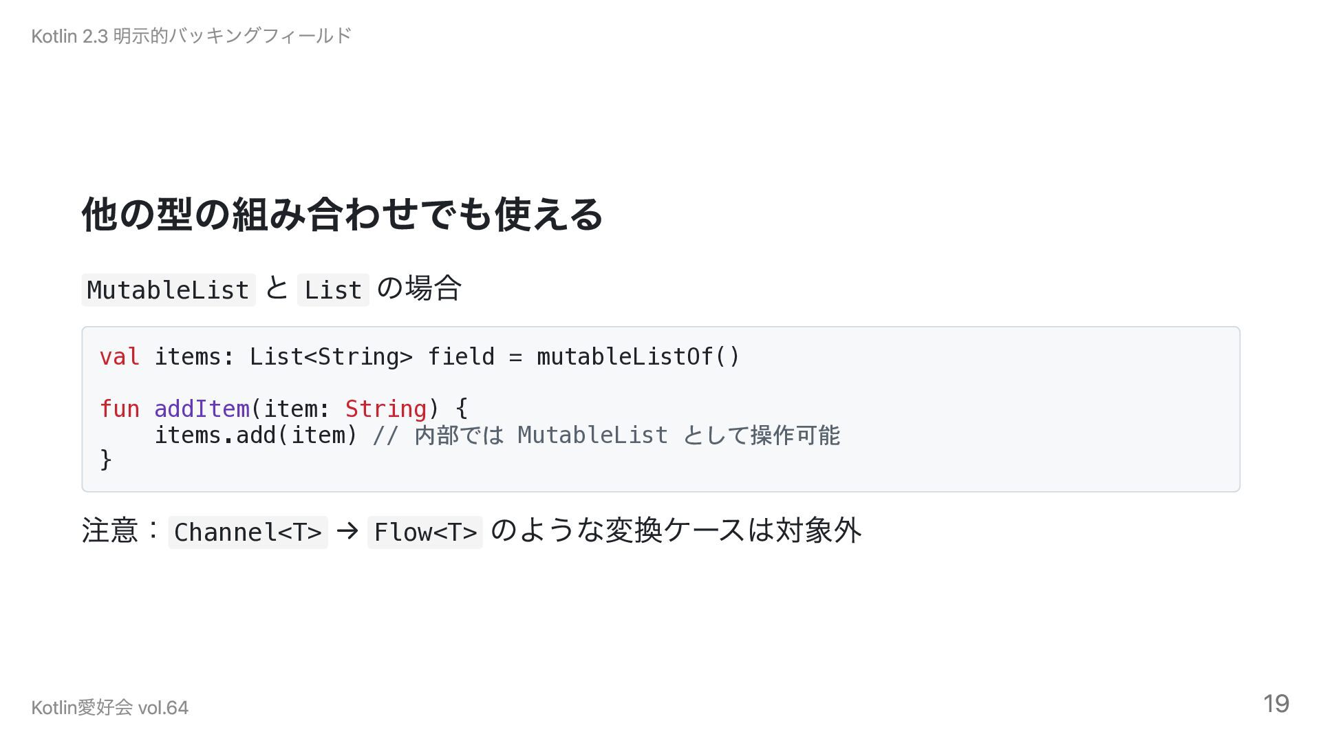 mutableListOf() fun addItem(item: String) { items.add(item) // 内部では MutableList として操作可能 } 注意:Channel<T> → Flow<T> のような変換ケースは対象外 Kotlin 2.3 明示的バッキングフィールド Kotlin愛好会 vol.64 19