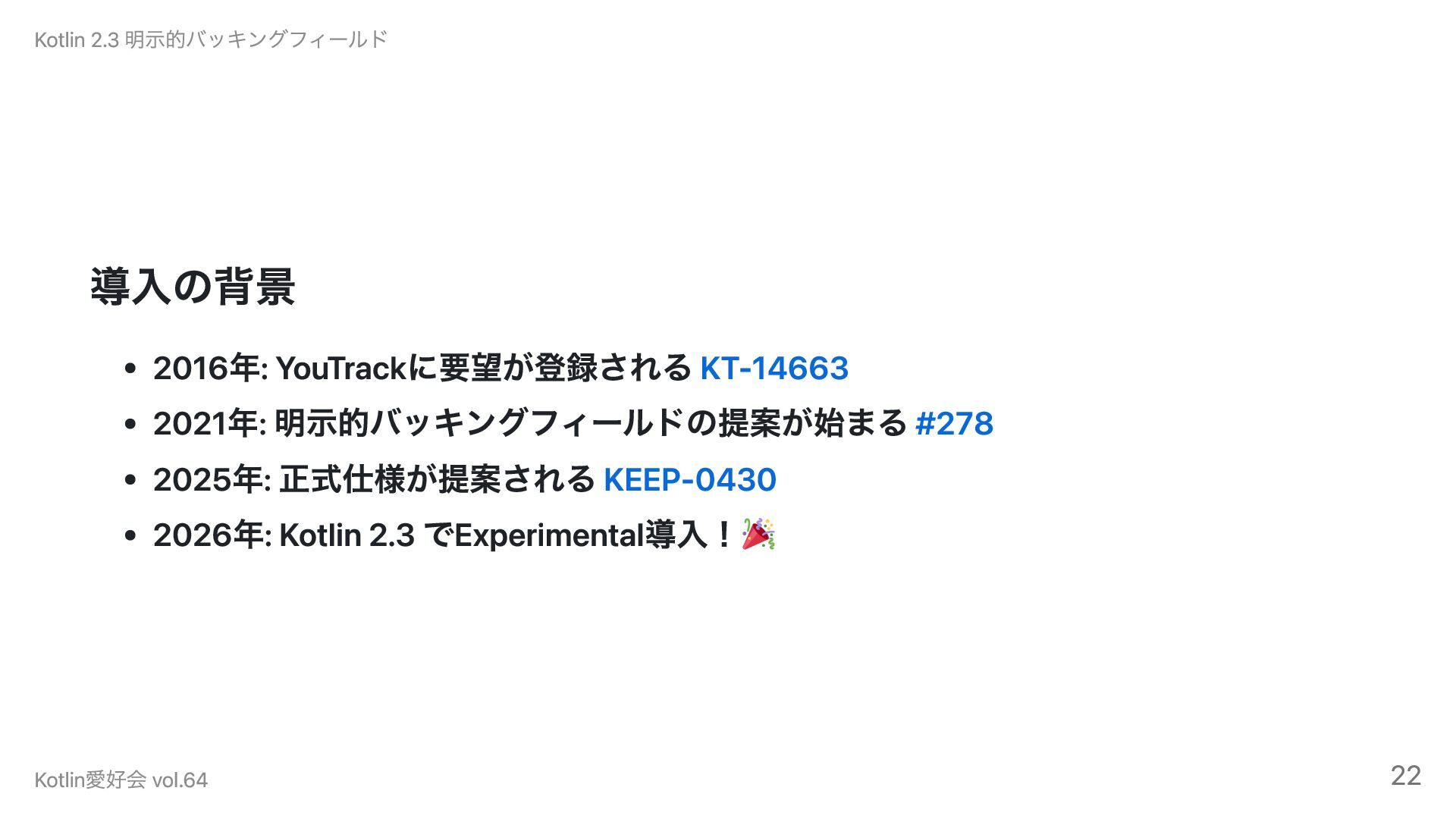導入の背景 2016年: YouTrackに要望が登録される KT-14663 2021年: 明示的バッキングフィールドの提案が始まる #278 2025年: 正式仕様が提案される KEEP-0430
