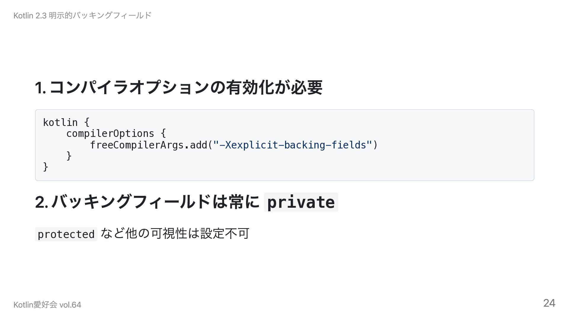 バッキングフィールドは常に private protected など他の可視性は設定不可 Kotlin 2.3 明示的バッキングフィールド Kotlin愛好会 vol.64 24
