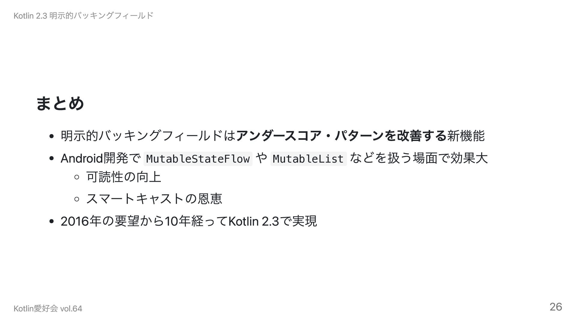 まとめ 明示的バッキングフィールドはアンダースコア・パターンを改善する新機能 Android開発で MutableStateFlow や MutableList などを扱う場面で効果大 可読性の向上 スマートキャストの恩恵 2016年の要望から10年経ってKotlin