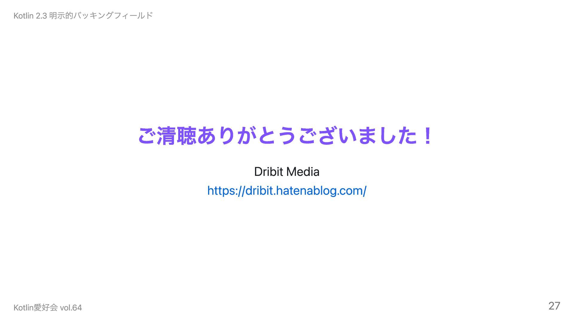 ご清聴ありがとうございました! Dribit Media https://dribit.hatenablog.com/ Kotlin 2.3 明示的バッキングフィールド Kotlin愛好会 vol.64 27