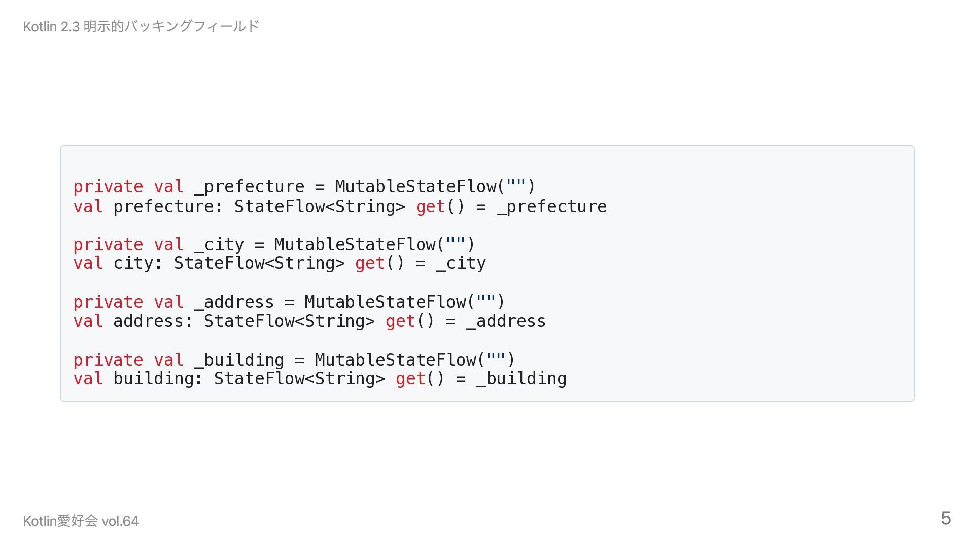 _prefecture private val _city = MutableStateFlow("") val city: StateFlow<String> get() = _city private val _address = MutableStateFlow("") val address: StateFlow<String> get() = _address private val _building = MutableStateFlow("") val building: StateFlow<String> get() = _building Kotlin 2.3 明示的バッキングフィールド Kotlin愛好会 vol.64 5