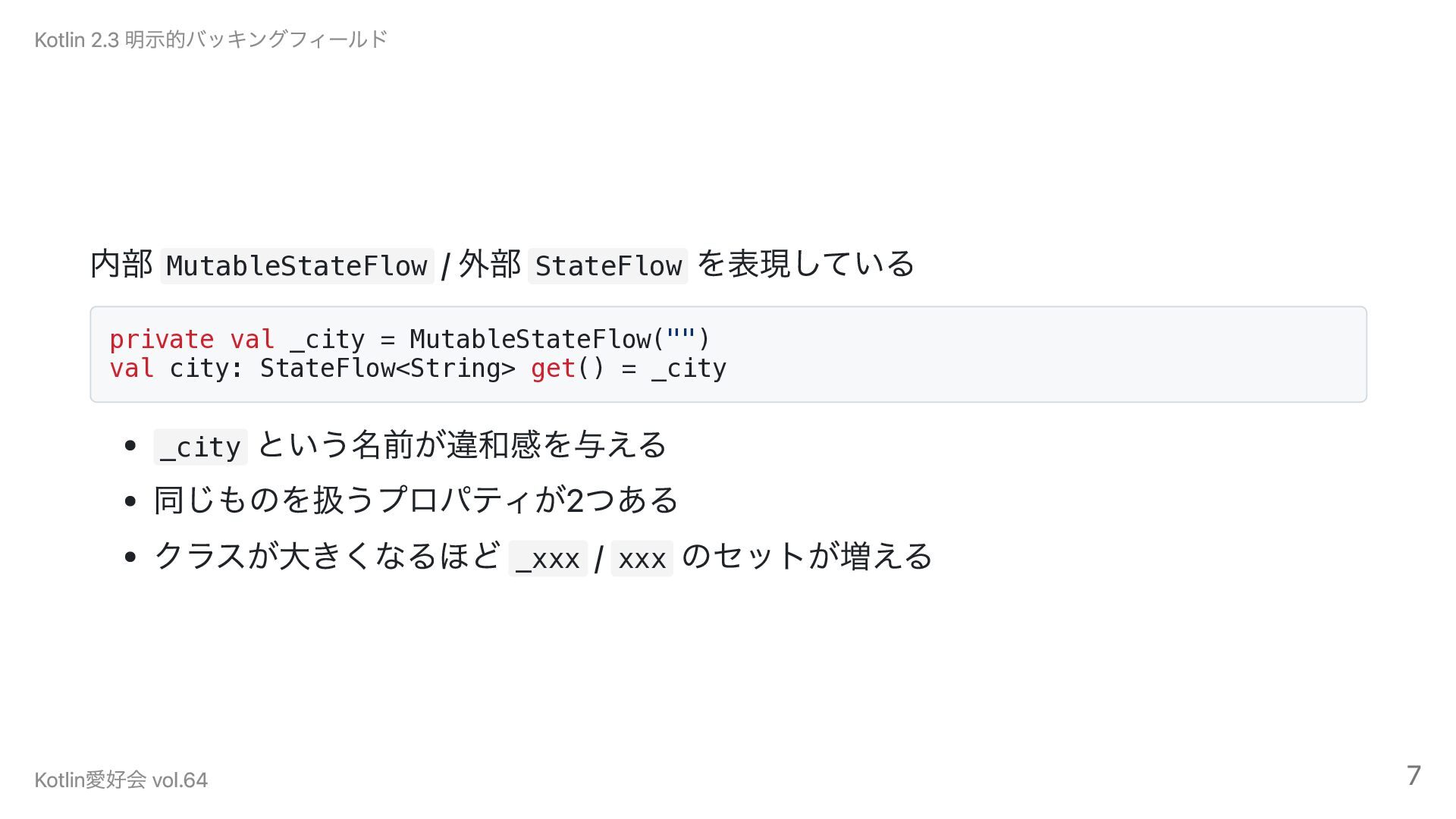 MutableStateFlow("") val city: StateFlow<String> get() = _city _city という名前が違和感を与える 同じものを扱うプロパティが2つある クラスが大きくなるほど _xxx / xxx のセットが増える Kotlin 2.3 明示的バッキングフィールド Kotlin愛好会 vol.64 7