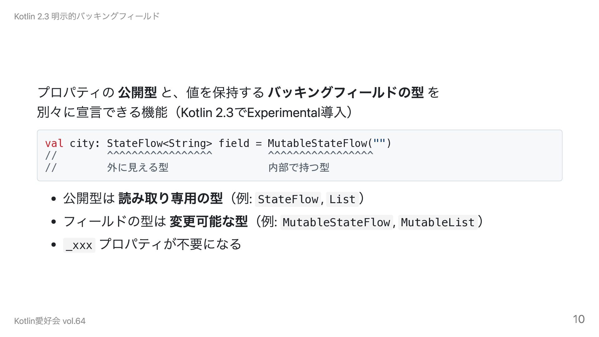 field = MutableStateFlow("") // ^^^^^^^^^^^^^^^^^ ^^^^^^^^^^^^^^^^^ // 外に見える型 内部で持つ型 公開型は 読み取り専用の型(例: StateFlow , List ) フィールドの型は 変更可能な型(例: MutableStateFlow , MutableList ) _xxx プロパティが不要になる Kotlin 2.3 明示的バッキングフィールド Kotlin愛好会 vol.64 10