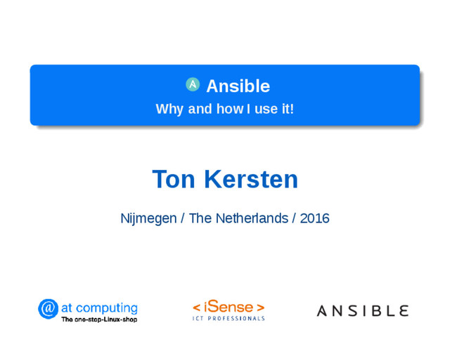 Computing UNIX Nerd (started in 1986 with SunOS 3) Linux Geek (started in 1992 with 0.96α) Scripting Nerd Configuration Management addict Free and Open Source Software enthusiast HAM Operator (pa1ton) Programming Plain text aficionado Big fan of things that just work Ansible user and contributor since 2012 · · · ans-v1.9-3