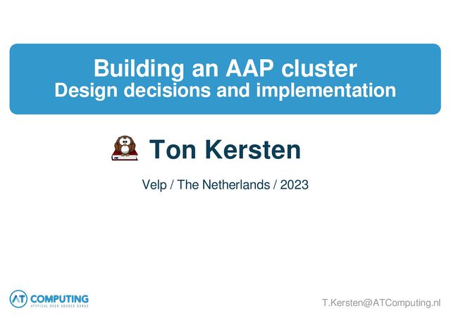 From: Groesbeek / The Netherlands • UNIX/Linux consultant and Trainer @ AT Computing • UNIX freak (started in 1986 with SunOS) • Linux Geek (started in 1992 with 0.96α) • Configuration Management Addict • Red Hat Certified System Engineer • Ansible user and contributor since 2012 • Member of the Ansible Organization on Github • Ansible Ambassador since 2015 • Co-organizer of the Ansible Benelux Meetup Group • Free and Open Source Software Enthusiast