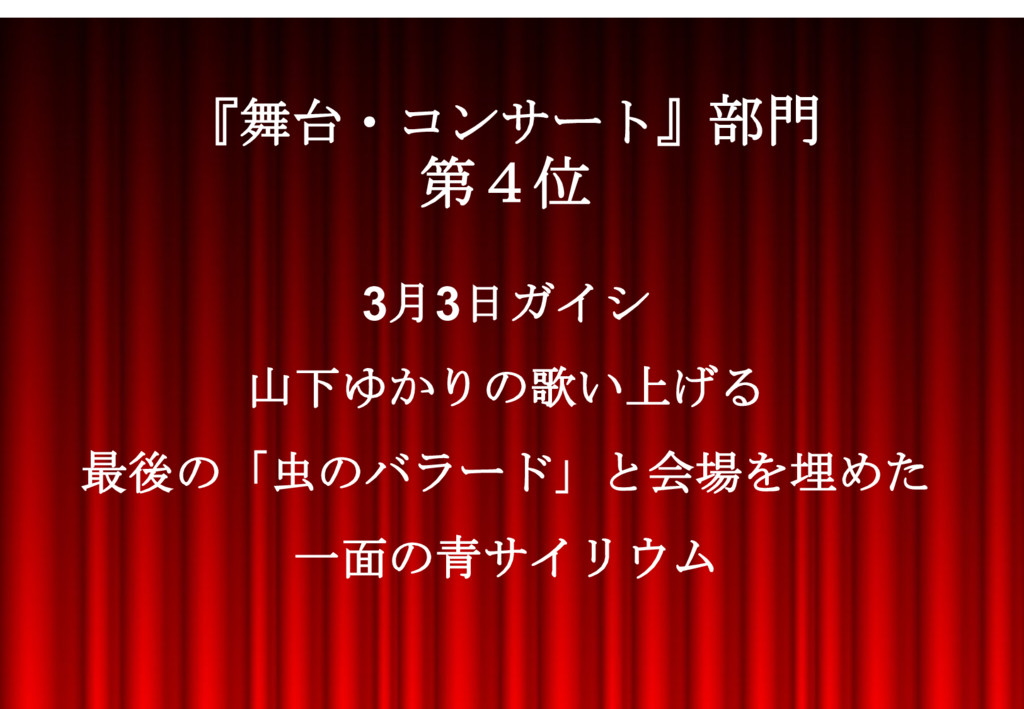 3月3日ガイシ 山下ゆかりの歌い上げる 最後の「虫のバラード」と会場を埋めた 一面の青サイリウム 『舞台・コンサート』部門 第4位