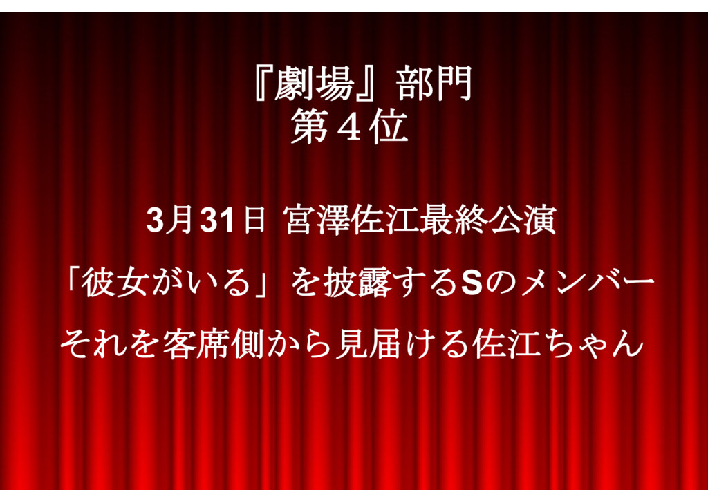 3月31日 宮澤佐江最終公演 「彼女がいる」を披露するSのメンバー それを客席側から見届ける佐江ちゃん 『劇場』部門 第4位