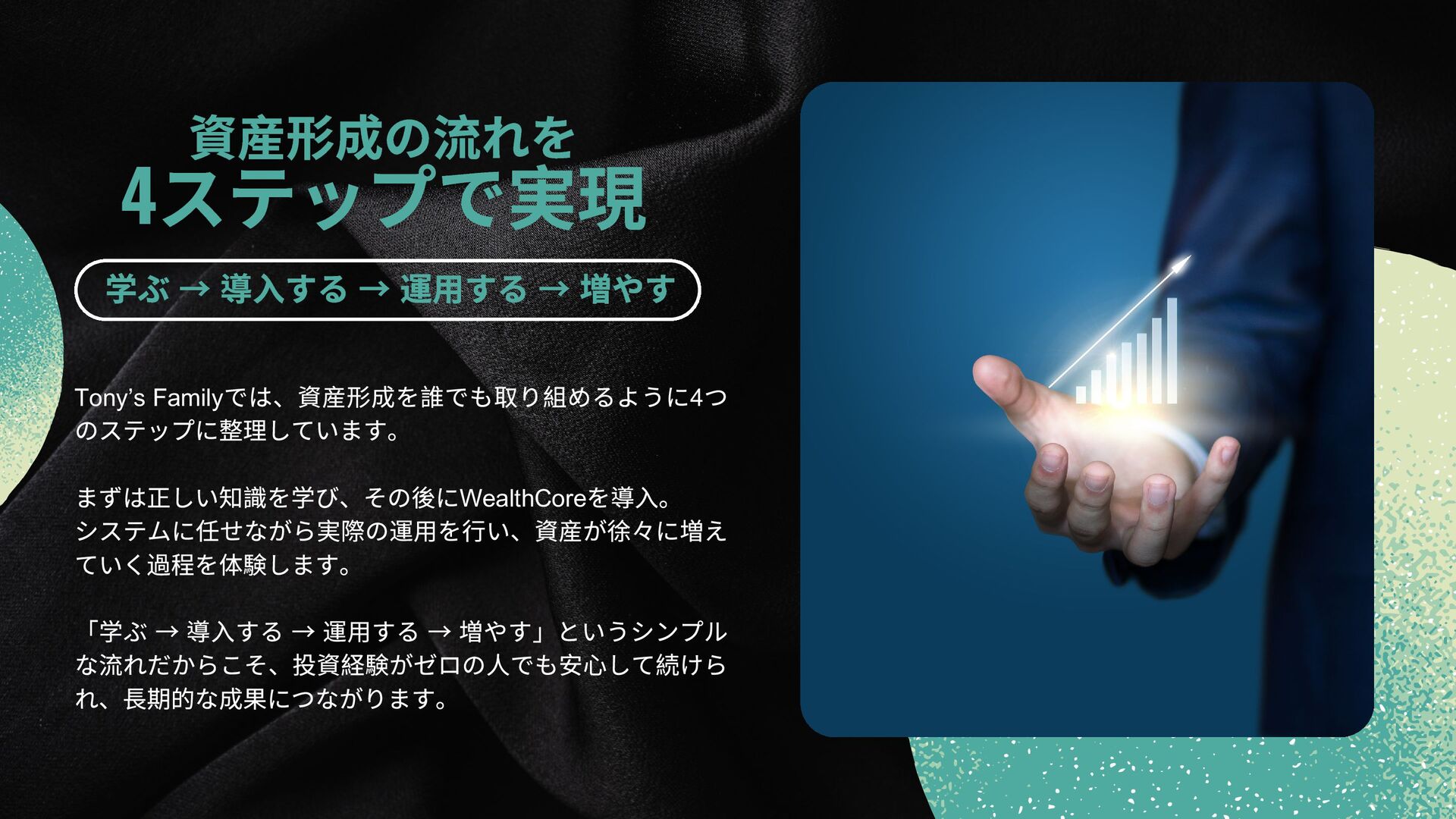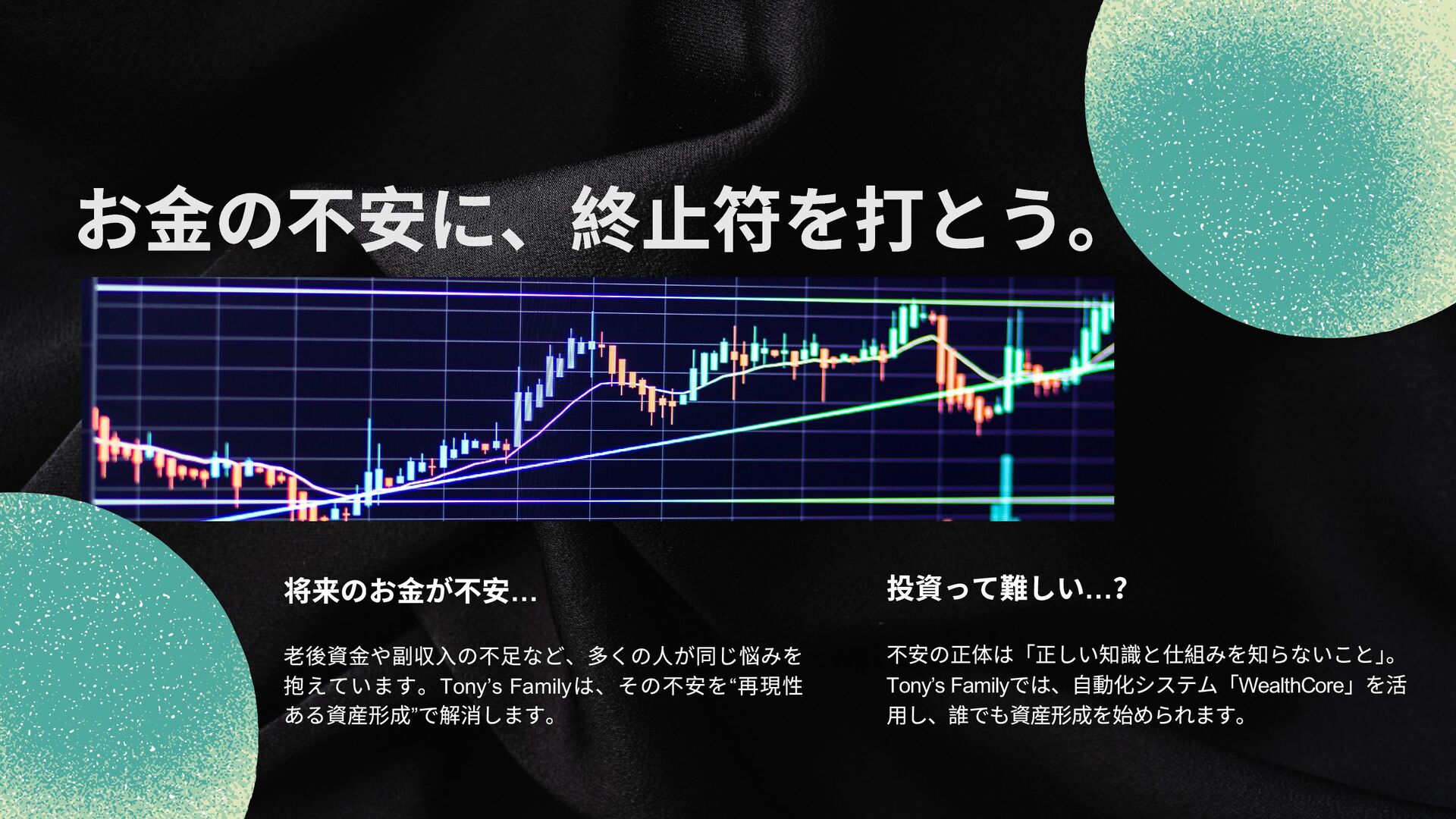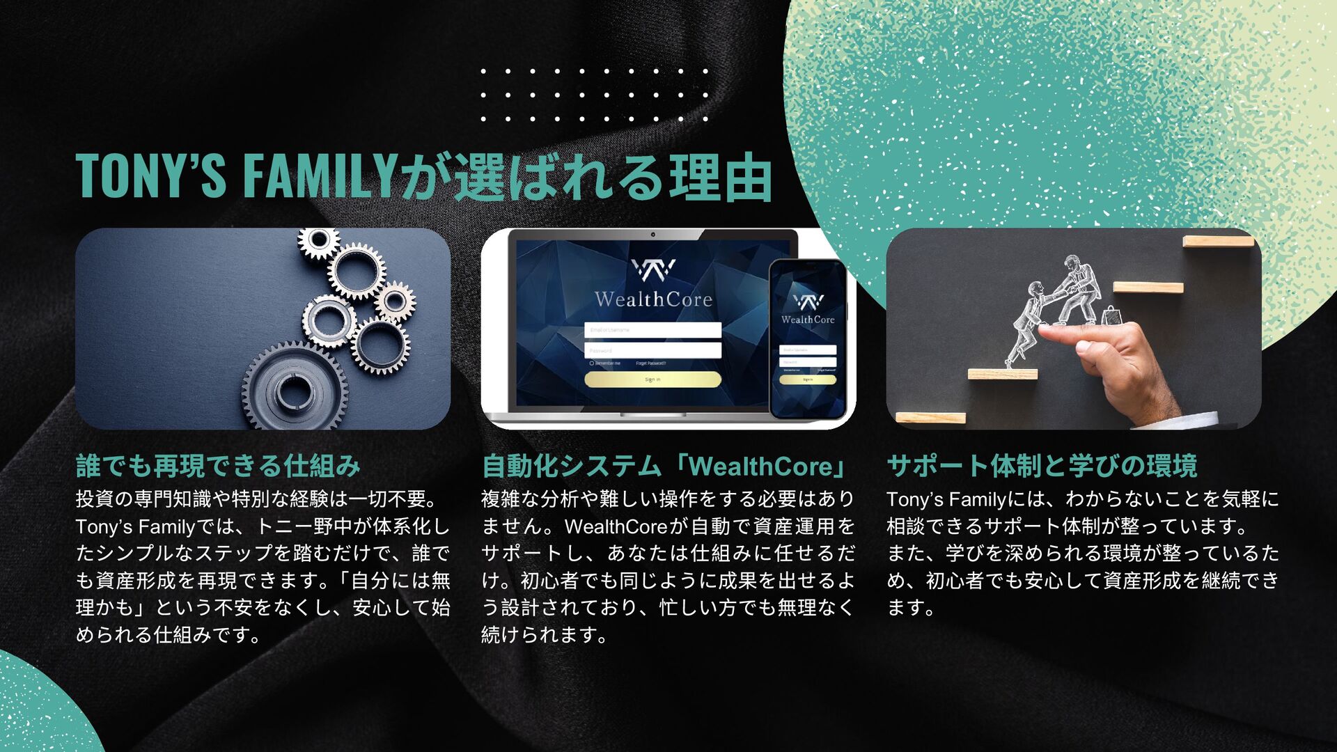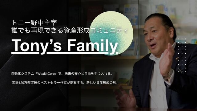 現在は、誰でも再現できる資産形成の仕組みを提供するコミュニティ「Tony’s Family」と自動化システム「WealthCore」を主宰し、投資初心者からベテランまで幅広く支援しています。