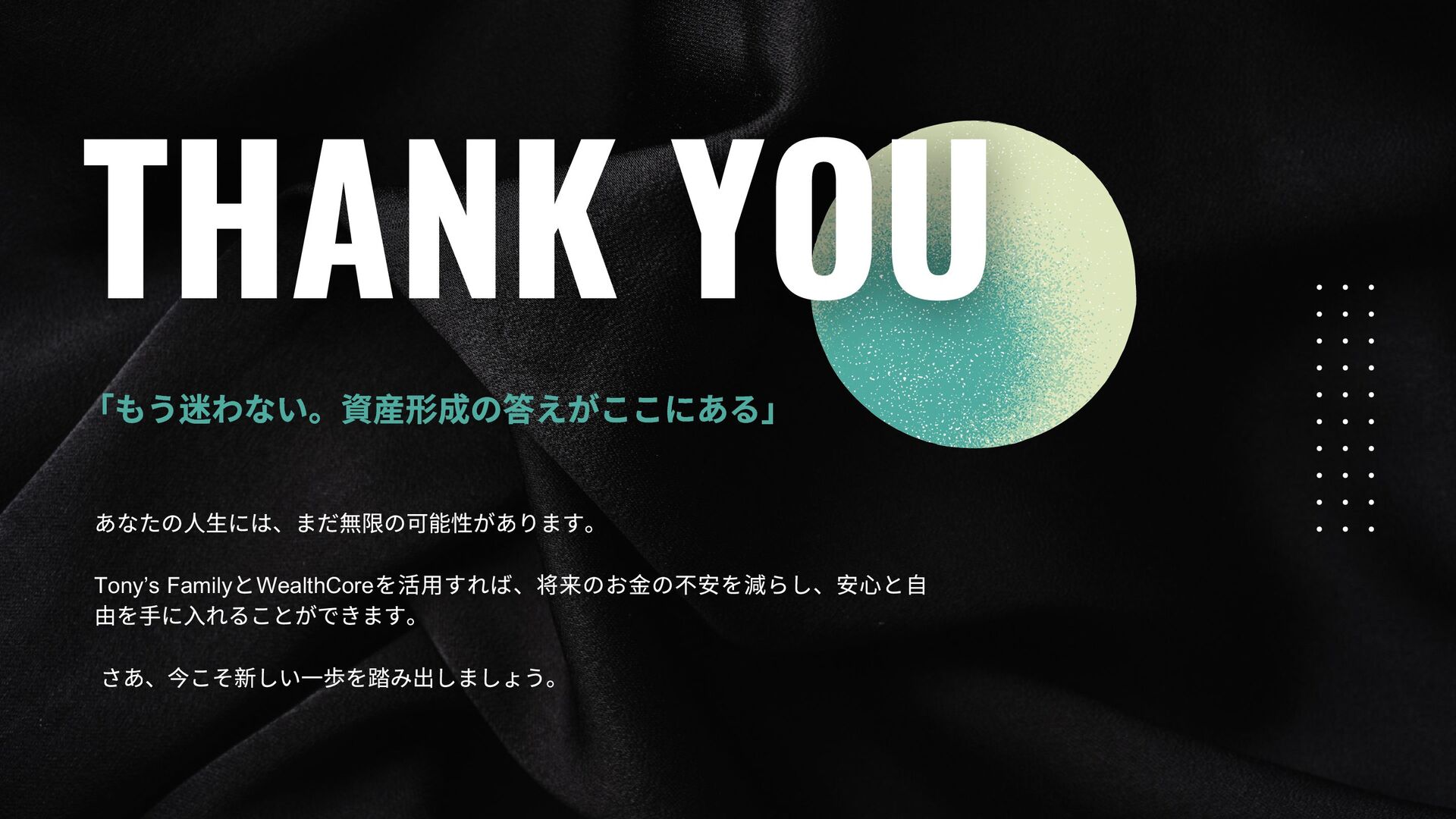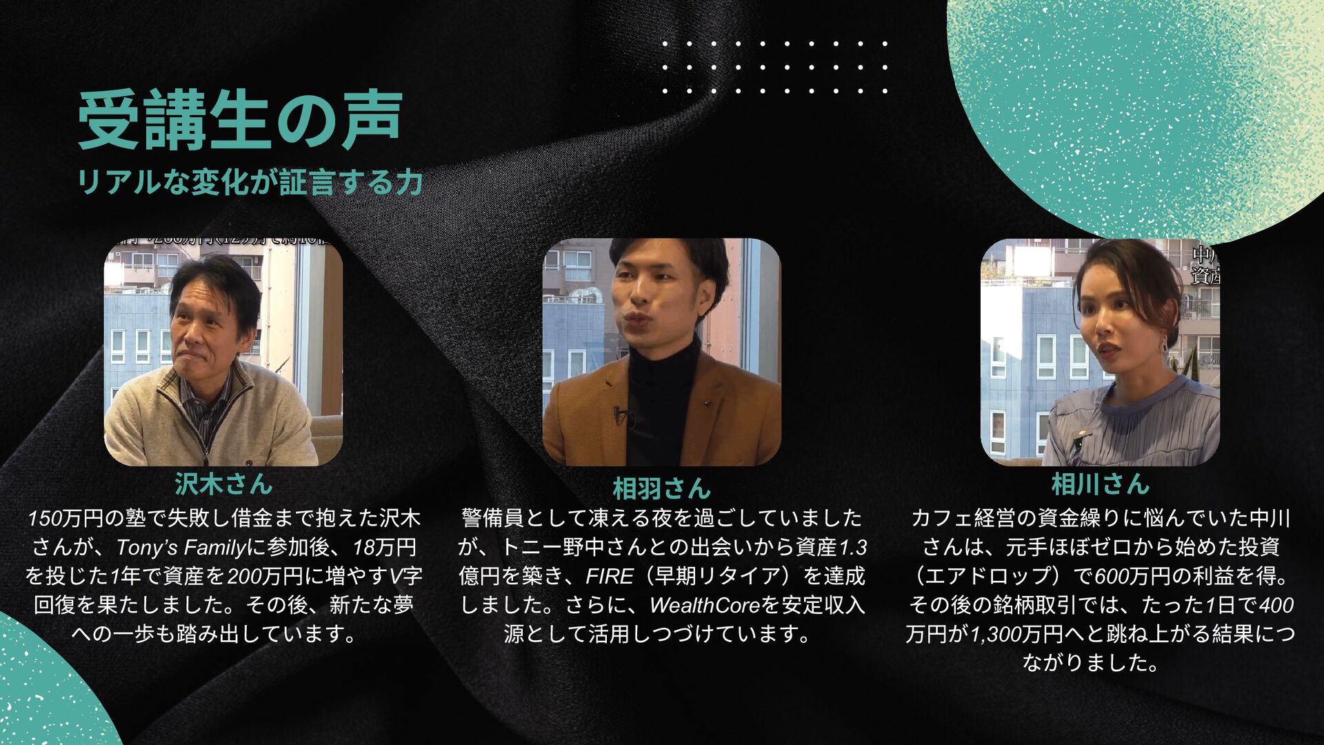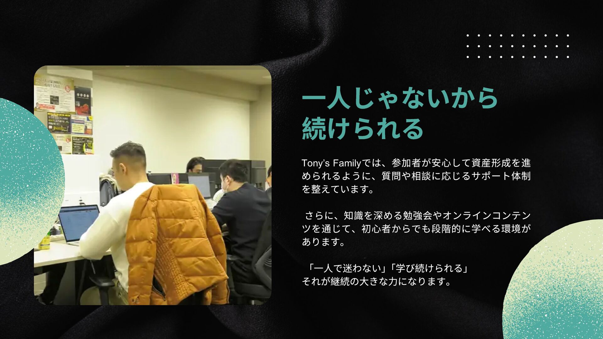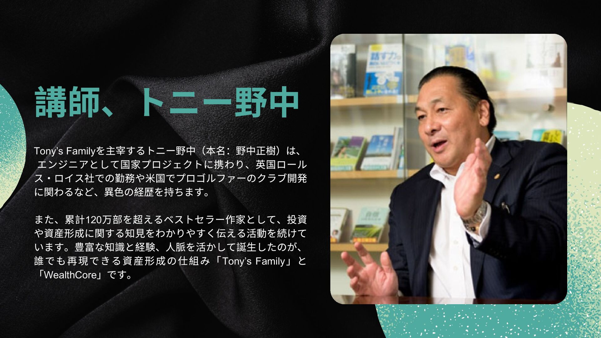 現在は、誰でも再現できる資産形成の仕組みを提供するコミュニティ「Tony’s Family」と自動化システム「WealthCore」を主宰し、投資初心者からベテランまで幅広く支援しています。