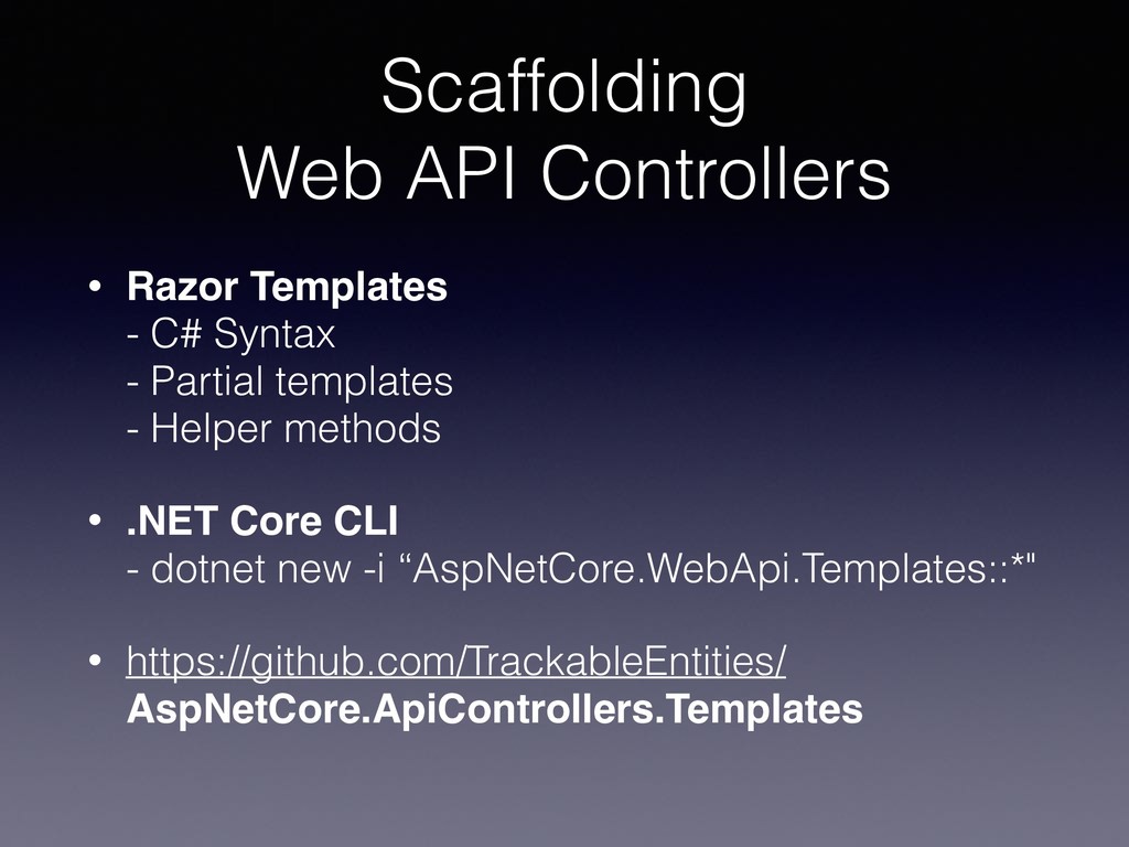 - Partial templates - Helper methods • .NET Core CLI - dotnet new -i “AspNetCore.WebApi.Templates::*" • https://github.com/TrackableEntities/ AspNetCore.ApiControllers.Templates