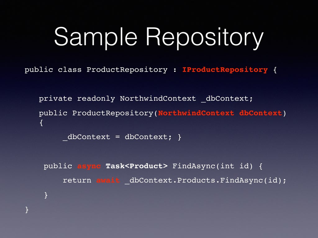 NorthwindContext _dbContext; public ProductRepository(NorthwindContext dbContext) { _dbContext = dbContext; } public async Task<Product> FindAsync(int id) { return await _dbContext.Products.FindAsync(id); } }