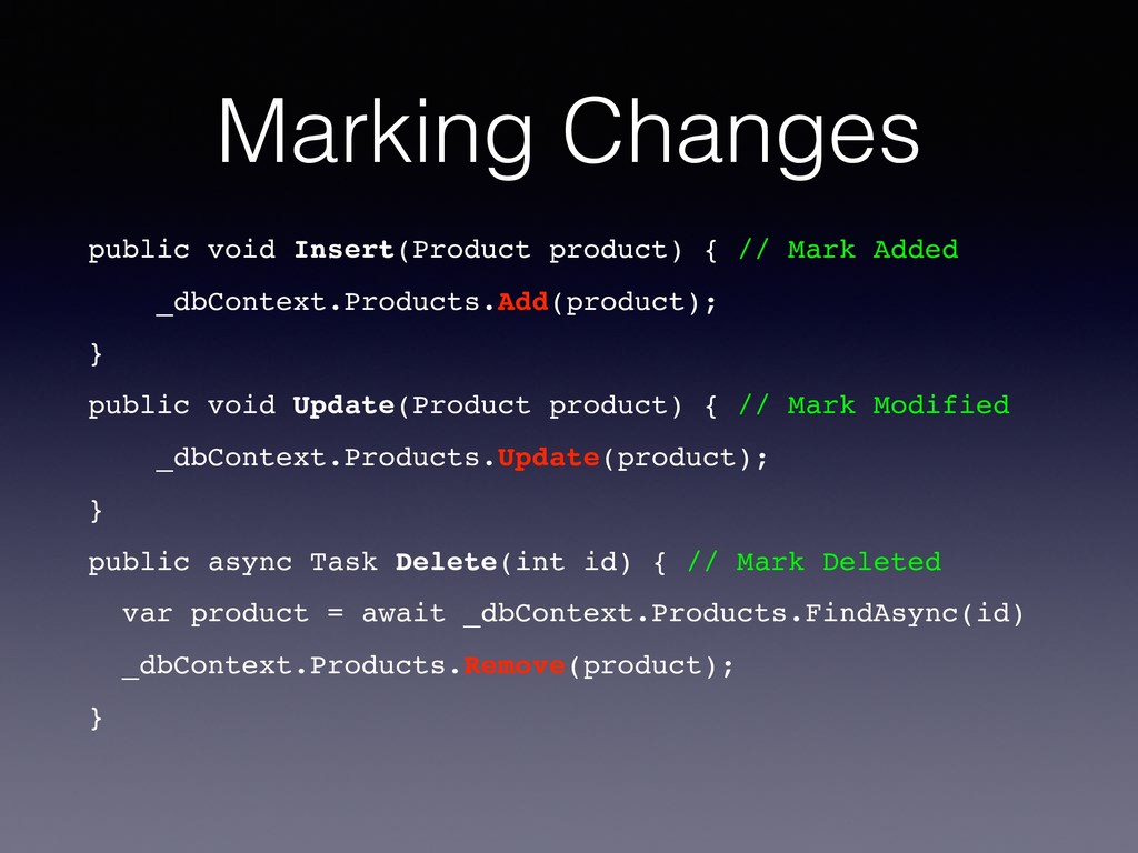 _dbContext.Products.Add(product); } public void Update(Product product) { // Mark Modified _dbContext.Products.Update(product); } public async Task Delete(int id) { // Mark Deleted var product = await _dbContext.Products.FindAsync(id) _dbContext.Products.Remove(product); }