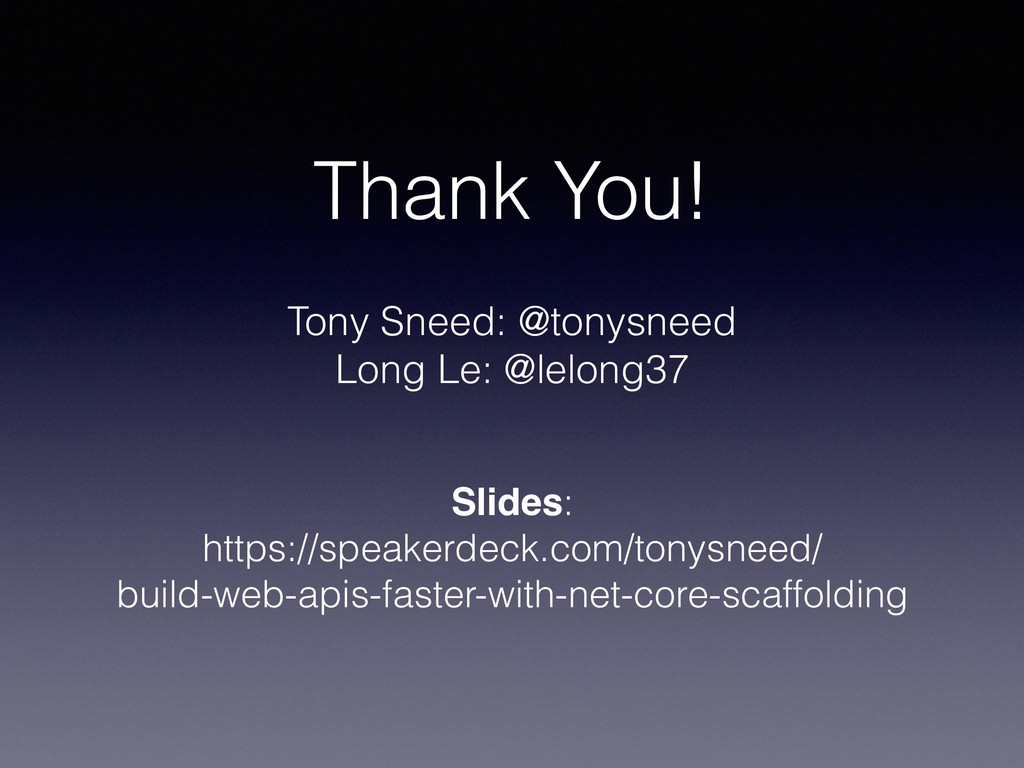 Thank You! Tony Sneed: @tonysneed Long Le: @lelong37 Slides: https://speakerdeck.com/tonysneed/