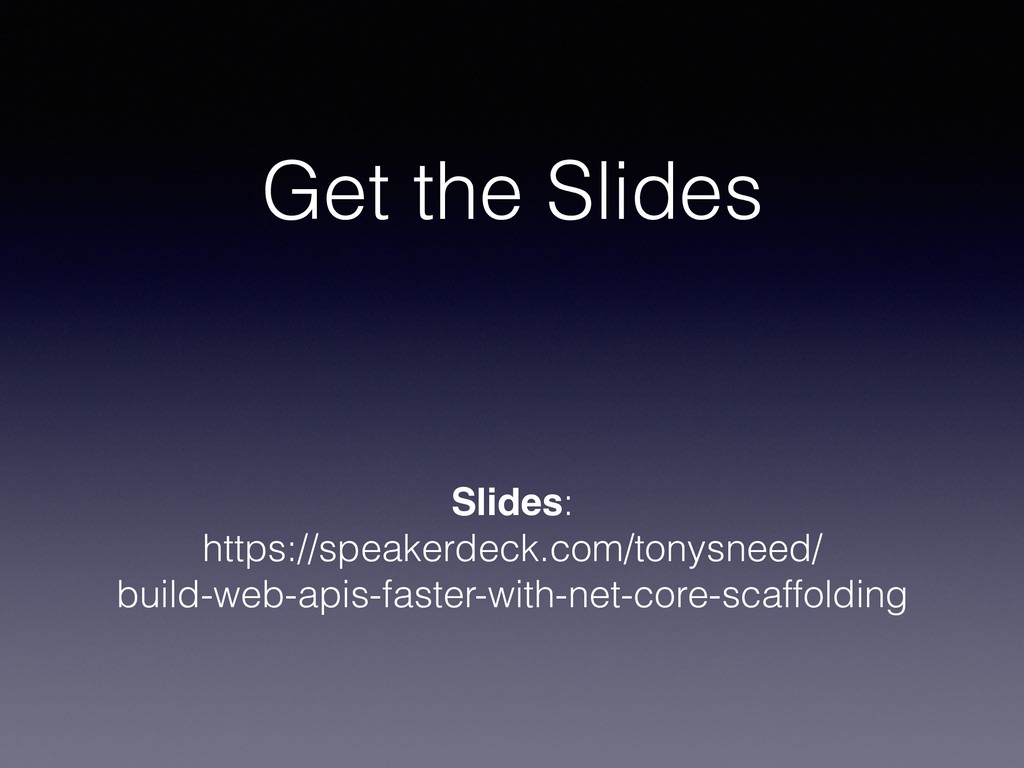 Get the Slides Slides: https://speakerdeck.com/tonysneed/ build-web-apis-faster-with-net-core-scaffolding
