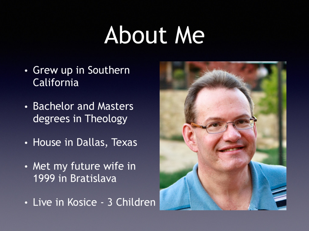 and Masters degrees in Theology • House in Dallas, Texas • Met my future wife in 1999 in Bratislava • Live in Kosice - 3 Children