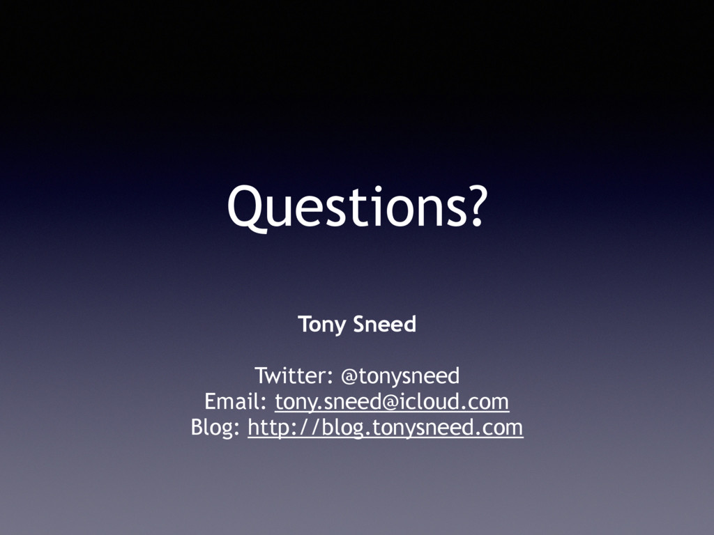 Questions? Tony Sneed Twitter: @tonysneed Email: