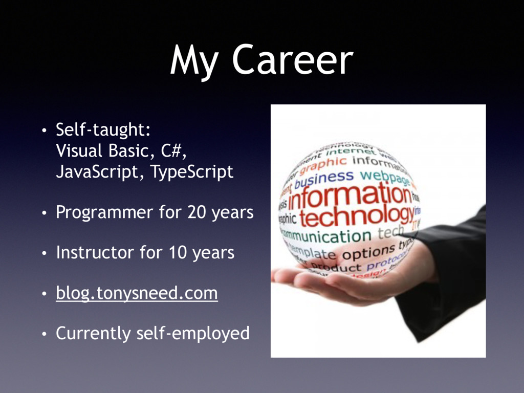 My Career • Self-taught: Visual Basic, C#, JavaScript, TypeScript •