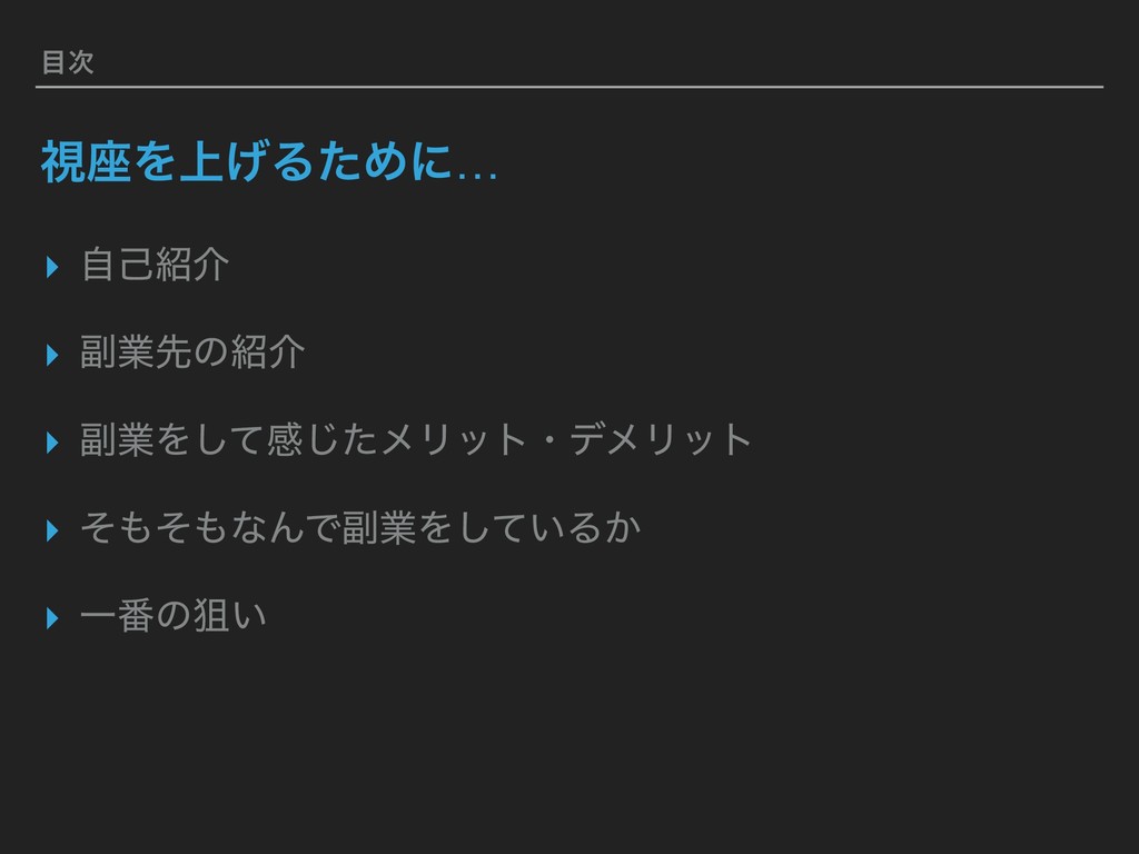࣍ ࢹ࠲Λ্͛ΔͨΊʹ… ▸ ࣗݾհ ▸ ෭ۀઌͷհ ▸ ෭ۀΛͯ͠ײͨ͡ϝϦοτɾσϝϦοτ ▸ ͦͦͳΜͰ෭ۀΛ͍ͯ͠Δ͔