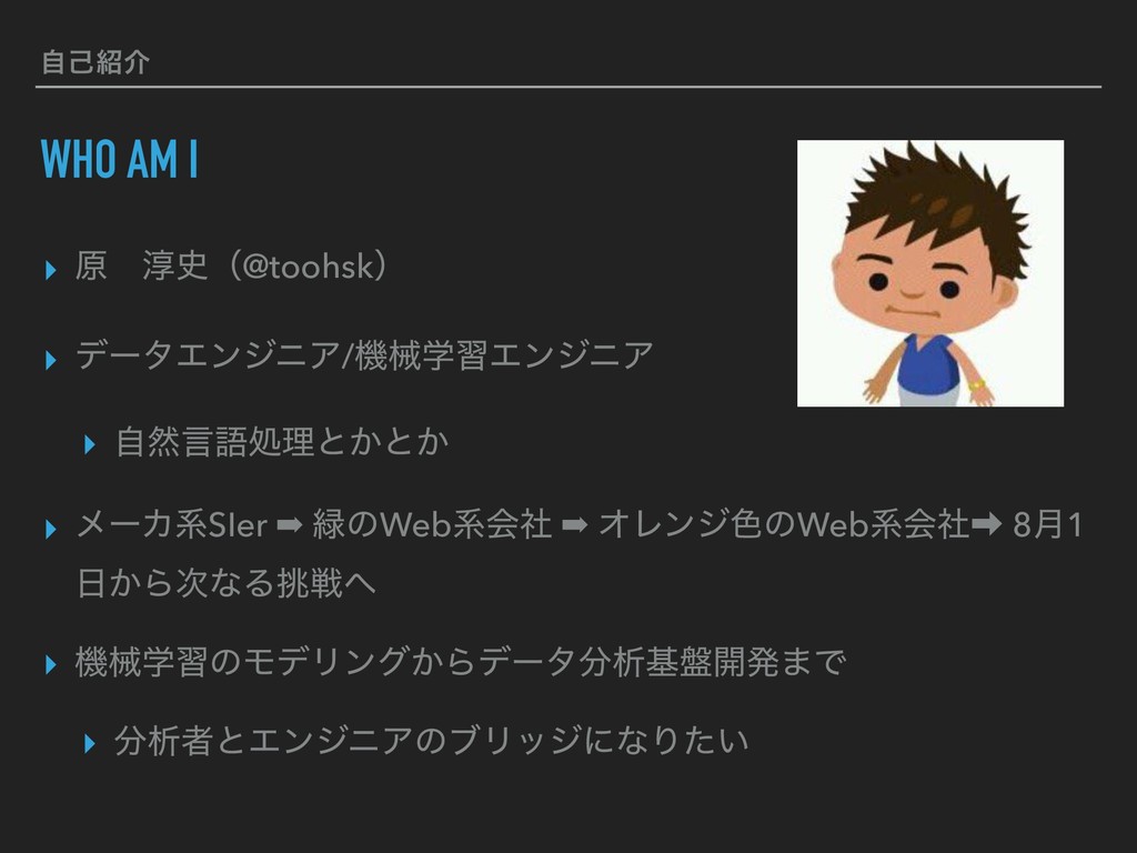 ࣗݾհ WHO AM I ▸ ݪɹ३࢙ʢ@toohskʣ ▸ σʔλΤϯδχΞ/ػցֶशΤϯδχΞ ▸ ࣗવݴޠॲཧͱ͔ͱ͔