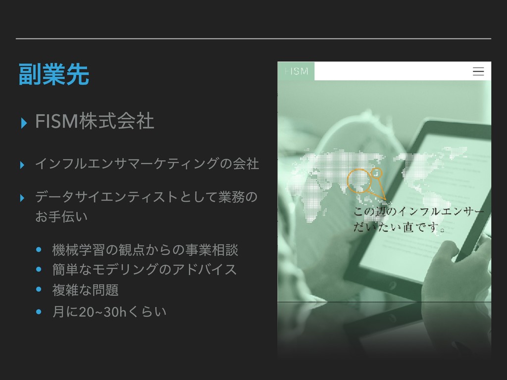 ෭ۀઌ ▸ FISMגࣜձࣾ ▸ ΠϯϑϧΤϯαϚʔέςΟϯάͷձࣾ ▸ σʔλαΠΤϯςΟετͱͯ͠ۀͷ ͓ख͍ • ػցֶशͷ؍͔Βͷࣄۀ૬ஊ