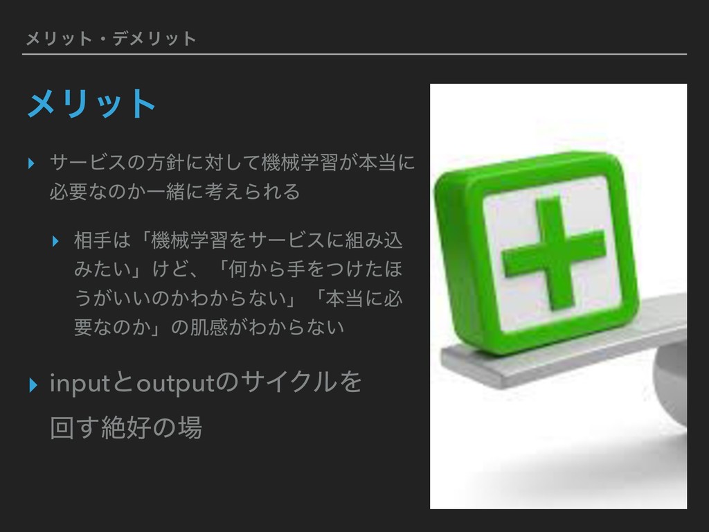 ϝϦοτɾσϝϦοτ ϝϦοτ ▸ αʔϏεͷํʹରͯ͠ػցֶश͕ຊʹ ඞཁͳͷ͔Ұॹʹߟ͑ΒΕΔ ▸ ૬खʮػցֶशΛαʔϏεʹΈࠐ Έ͍ͨʯ͚ͲɺʮԿ͔ΒखΛ͚ͭͨ΄ ͏͕͍͍ͷ͔Θ͔Βͳ͍ʯʮຊʹඞ ཁͳͷ͔ʯͷഽײ͕Θ͔Βͳ͍