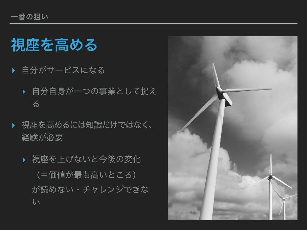 Ұ൪ͷૂ͍ ࢹ࠲ΛߴΊΔ ▸ ͕ࣗαʔϏεʹͳΔ ▸ ͕ࣗࣗҰͭͷࣄۀͱͯ͠ଊ͑ Δ ▸ ࢹ࠲ΛߴΊΔʹ͚ࣝͩͰͳ͘ɺ ܦݧ͕ඞཁ