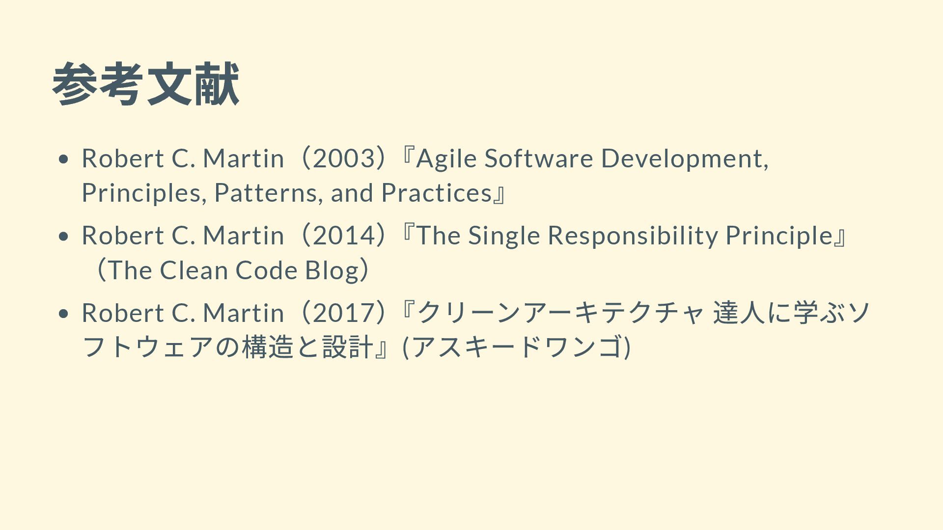 - Robert C. Martin(2014)『The Single Responsibility Principle』(The Clean Code Blog)