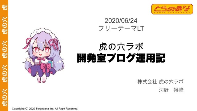 の穴 虎の穴 Copyright (C) 2020 Toranoana Inc. All Right Reserved. 2020/06/24 フリーテーマLT 虎の穴ラボ 開発室ブログ運用記 株式会社 虎の穴ラボ 河野 裕隆