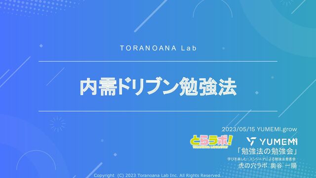 O R A N O A N A L a b 内需ドリブン勉強法 2023/05/15 YUMEMI.grow x 「勉強法の勉強会」 学びを楽しむ ! エンジニアによる勉強法発表会 虎の穴ラボ 奥谷 一陽