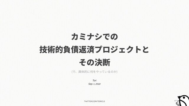 Twitter.com/Toricls カミナシでの 技術的負債返済プロジェクトと その決断 Tori Sep. 1, 2022 めぇ (で、具体的に何をやっているのか)