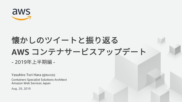 rights reserved. Yasuhiro Tori Hara (@toricls) Containers Specialist Solutions Architect Amazon Web Services Japan Aug. 29, 2019 懐かしのツイートと振り返る AWS コンテナサービスアップデート - 2019年上半期編 -