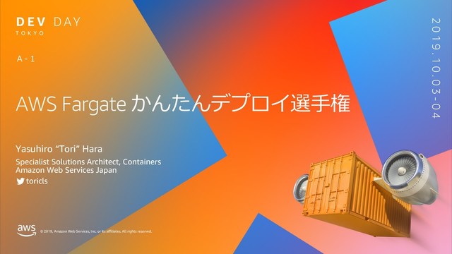 rights reserved. T O K Y O 2 0 1 9 . 1 0 . 0 3 - 0 4 AWS Fargate かんたんデプロイ選⼿権 Yasuhiro “Tori” Hara Specialist Solutions Architect, Containers Amazon Web Services Japan toricls A - 1