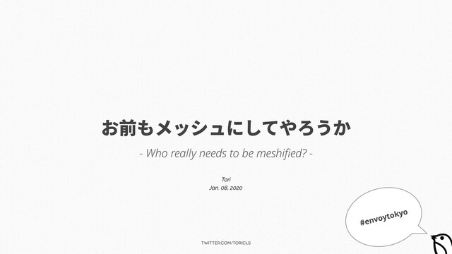 twitter.com/toricls サービスメッシュ導⼊のモチベーション マイクロサービスならではの課題と向き合いはじめると… ▶ 安定したサービス間通信を⼀貫性を持って実現したい ▶ リトライ、サービスディスカバリ、サーキットブレイキング、タイムアウト、 スロットリング… ▶ システム全体の可観測性を⼀貫性を持って担保したい