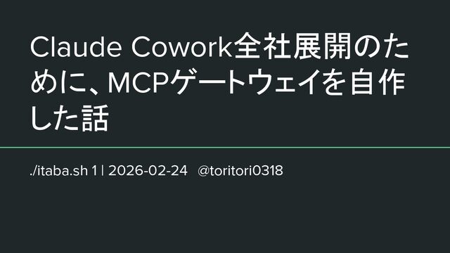 Claude Cowork全社展開のた めに、MCPゲートウェイを自作 した話 ./itaba.sh 1 | 2026-02-24 @toritori0318