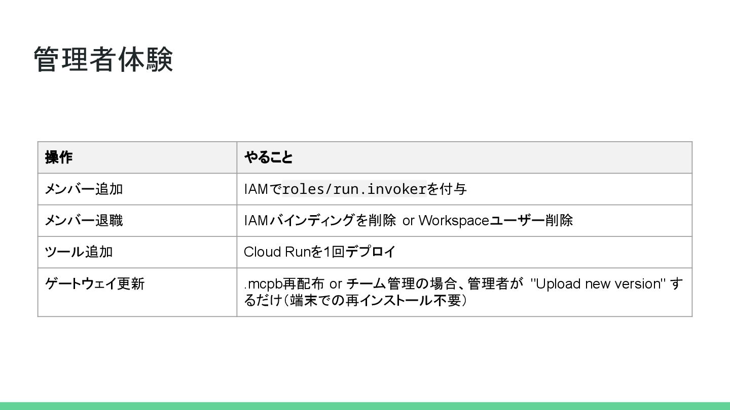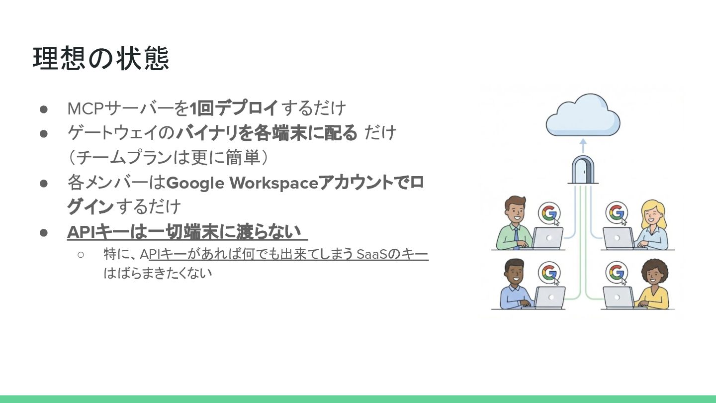 理想の状態 • MCPサーバーを1回デプロイ するだけ • ゲートウェイのバイナリを各端末に配る だけ (チームプランは更に簡単) • 各メンバーはGoogle