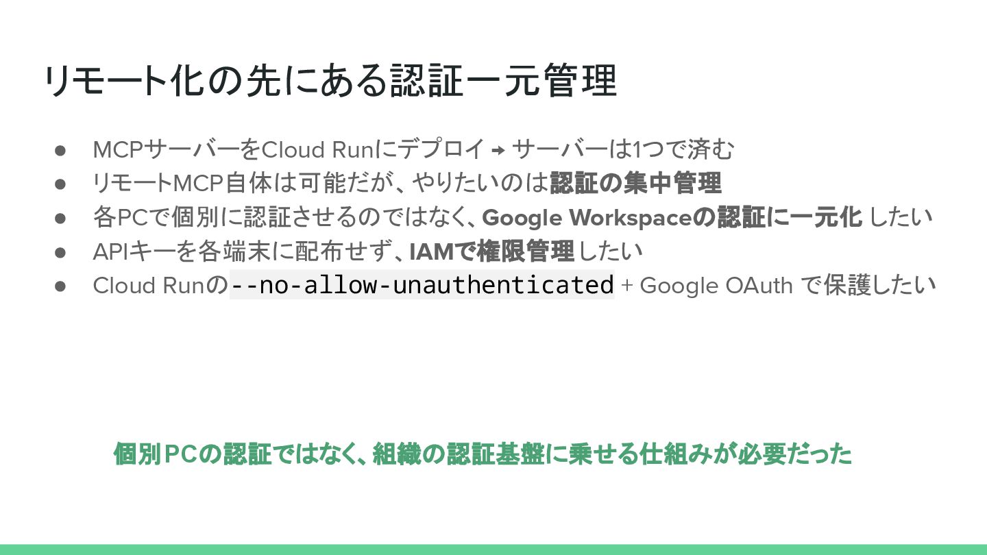 リモート化の先にある認証一元管理 • MCPサーバーをCloud Runにデプロイ → サーバーは1つで済む • リモートMCP自体は可能だが、やりたいのは認証の集中管理 • 各PCで個別に認証させるのではなく、Google