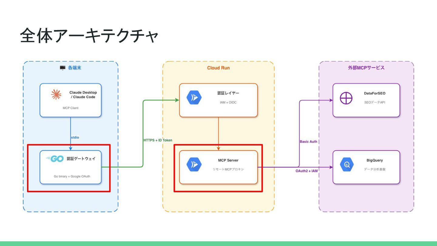 Workspaceの認証に一元化 したい • APIキーを各端末に配布せず、IAMで権限管理 したい • Cloud Runの--no-allow-unauthenticated + Google OAuth で保護したい 個別PCの認証ではなく、組織の認証基盤に乗せる仕組みが必要だった