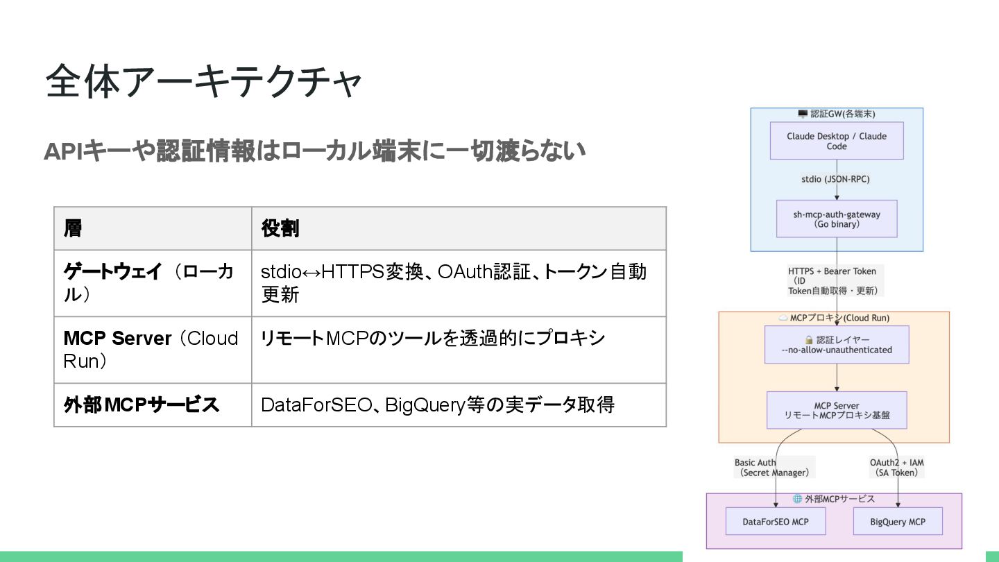 全体アーキテクチャ APIキーや認証情報はローカル端末に一切渡らない 層 役割 ゲートウェイ (ローカ ル) stdio↔HTTPS変換、OAuth認証、トークン自動 更新 MCP